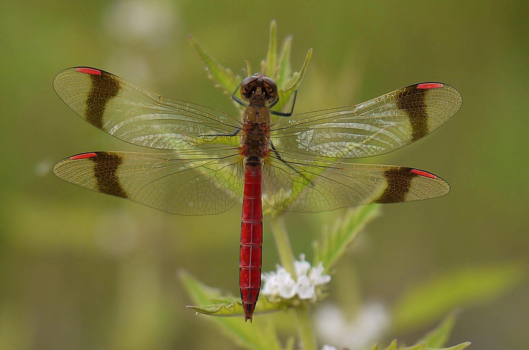 Lengte: 28-35 mm. Kleine heidelibel met onmiskenbare vleugeltekening: in de tophelft van iedere vleugel loopt een donkerbruine dwarsband. In Noordwest-Europa komen geen andere libellen voor met een vergelijkbare vleugeltekening. Pterostigma’s groot. De poten zijn geheel zwart. Mannetje: achterlijf elliptisch verbreed; breedste punt ongeveer ter hoogte van segment 7. Uitgekleurde mannetjes krijgen een dieprood achterlijf en rode pterostigma’s. Jonge mannetjes lijken qua lichaamskleur op vrouwtjes. Vrouwtje: achterlijf geel, later bruin. Onderzijde van het achterlijf meestal zwart, vaak in zijaanzicht nog zichtbaar als een zwarte streep. Pterostigma’s opvallend crèmekleurig. De vorm van de hamulus (mannetjes) en legschede (vrouwtjes) kan uitsluitsel geven bij het determineren van heidelibellen. Het dier moet hiervoor echter worden gevangen en met een loep worden bekeken.