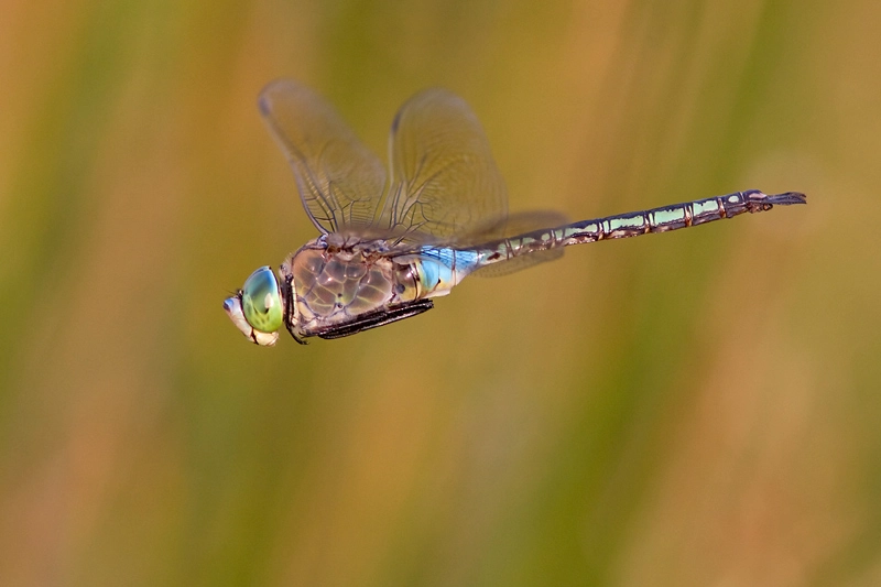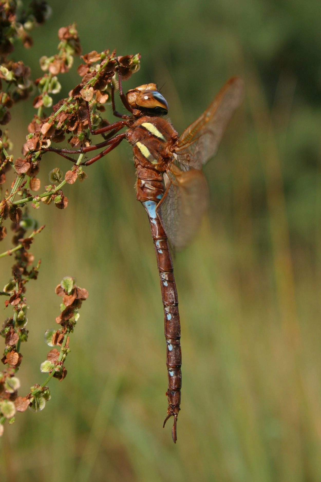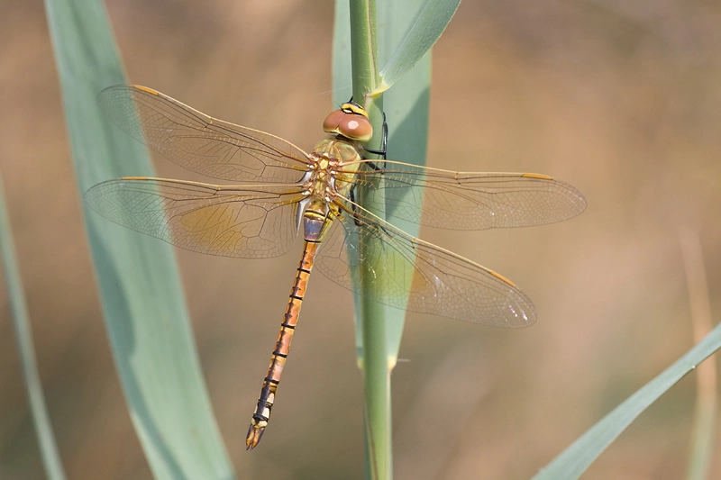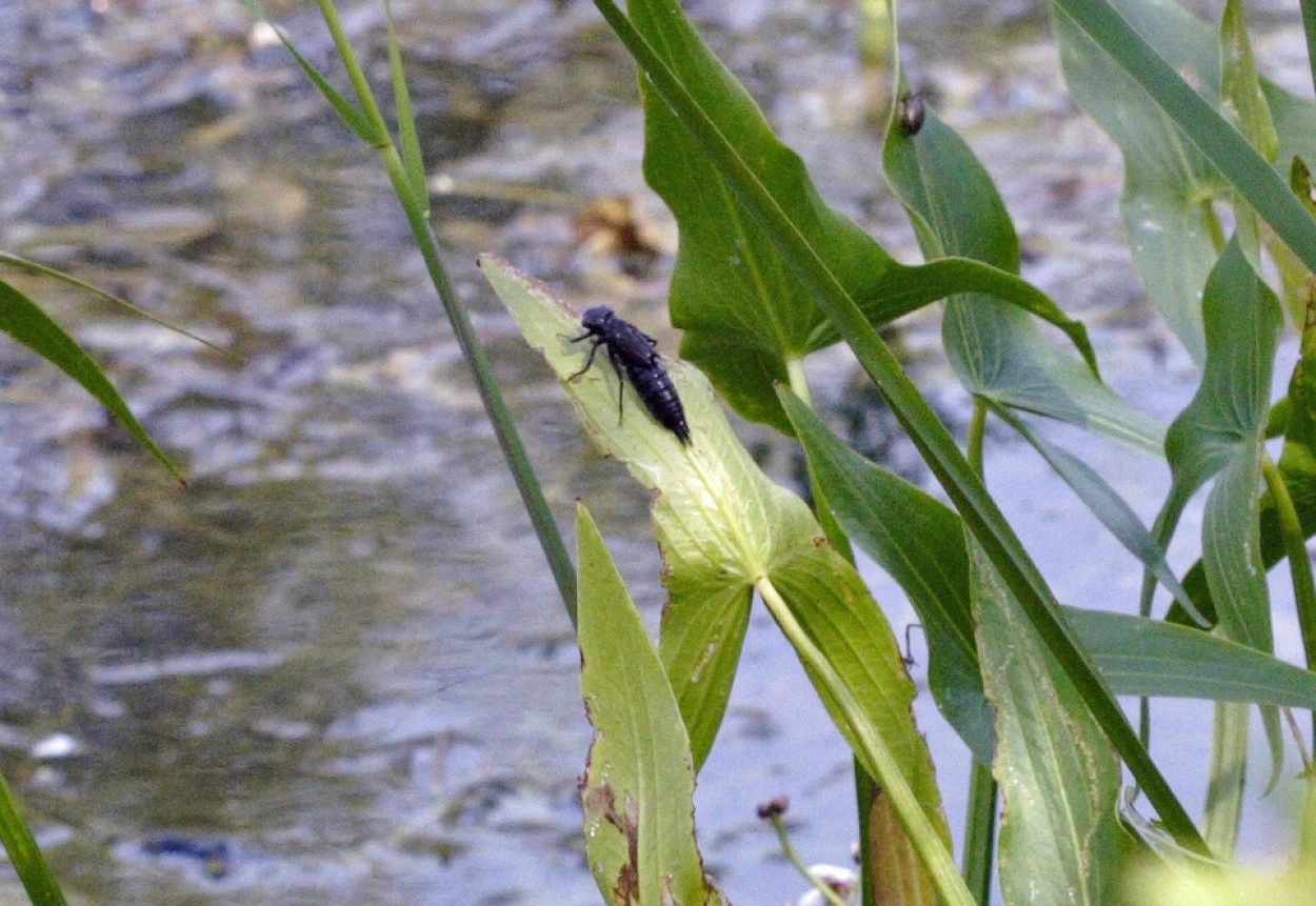 Duurt een of twee jaar. De (eerste) winter wordt als ei doorgebracht. Uitsluipen gebeurt van begin juni tot in september, met een piek in juli en augustus. De larvenhuidjes hebben vaak een bonte rugtekening en een lichte band over de epiproct. Ze zijn te vinden in de oevervegetatie tot circa een halve meter hoogte."