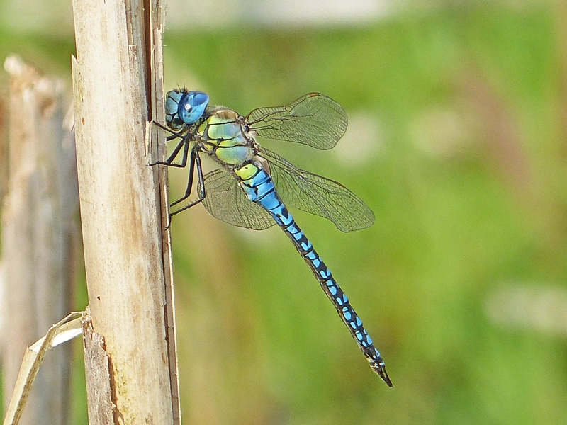 Lengte 41-46 mm. Vrij groot en breed met een kort prementum, korte cercus en een zijdoorn op segment 6. Onder vergroting is te zien dat de soort een gebogen achterrand heeft van de ogen en karakteristieke lichte vlekken op de occiput.