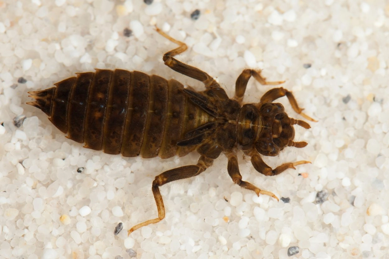 De larven overwinteren drie, soms twee of vier keer. Uitsluipen gebeurt vanaf eind mei tot in augustus. De larvenhuidjes zijn doorgaans te vinden op een hoogte van enkele decimeters in verticale houding in de oevervegetatie, op steilranden of op waterbouwkundige kunstwerken zoals brugpijlers. Voor het eierleggen vliegt het wijfje zonder mannetje over rustige gedeelten van een riviertje of beek en tipt met de punt van het achterlijf de eieren in het water af. Eieren zijn ovaal en ca. 0,5 mm lang, met aan één pool een stomp uitsteekseltje.