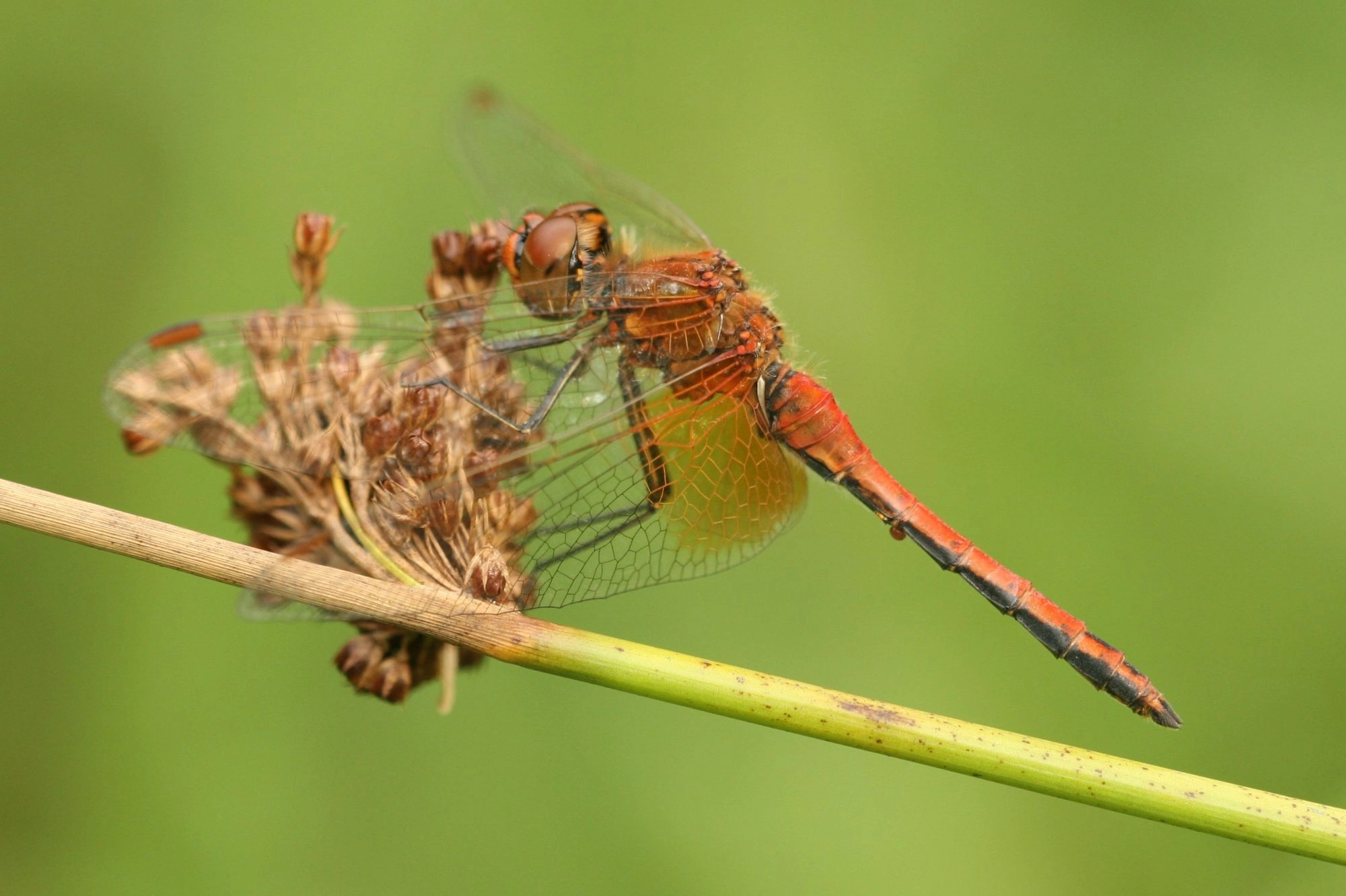 Lengte: 32-37 mm. Meestal eenvoudig te herkennen aan de grote oranjegele vlekken in de vleugels. Poten zwart met geel gestreept. Mannetje: tenminste een grote oranje vlek in de basis van de achtervleugels, vaak reikend tot aan de knoop (maar soms wat kleiner). Bij sommige exemplaren is ook de basis van de voorvleugels oranje getint. Achterlijf recht, zonder verbredingen. Bij uitgekleurde mannetjes is het achterlijf in bovenaanzicht donkeroranje tot rood. De onderzijde is uitgebreid zwart, waardoor in zijaanzicht een doorlopende zwarte streep te zien is (dus onderaan de zijkanten van het achterlijf). Jonge mannetjes lijken qua achterlijfkleur meer op vrouwtjes. Vrouwtje: hoeveelheid geel in de vleugels variabel. Veel vrouwtjes hebben naast geel in de vleugelbasis ook een gele vlek rond de knoop (halverwege de vleugelvoorrand). Een klein deel van de vrouwtjes heeft echter slechts kleine vlekken in de basis van de achtervleugels. Grondkleur van het achterlijf eerst geel, later strokleurig. Het achterlijf heeft in zijaanzicht meestal twee vrijwel doorlopende zwarte lengtestrepen: een helemaal aan de onderkant van de achterlijfzijde en een meer centraal. Bij oude vrouwtjes raakt de onderkant van het achterlijf vaak zilvergrijs bestoven, waardoor de onderste zwarte lengtestreep niet meer opvalt. De meer centraal geplaatste doorlopende zwarte lengtestreep blijft altijd opvallend zichtbaar. De vorm van de hamulus (mannetjes) en legschede (vrouwtjes) kan uitsluitsel geven bij het determineren van heidelibellen. Het dier moet hiervoor echter worden gevangen en met een loep worden bekeken.