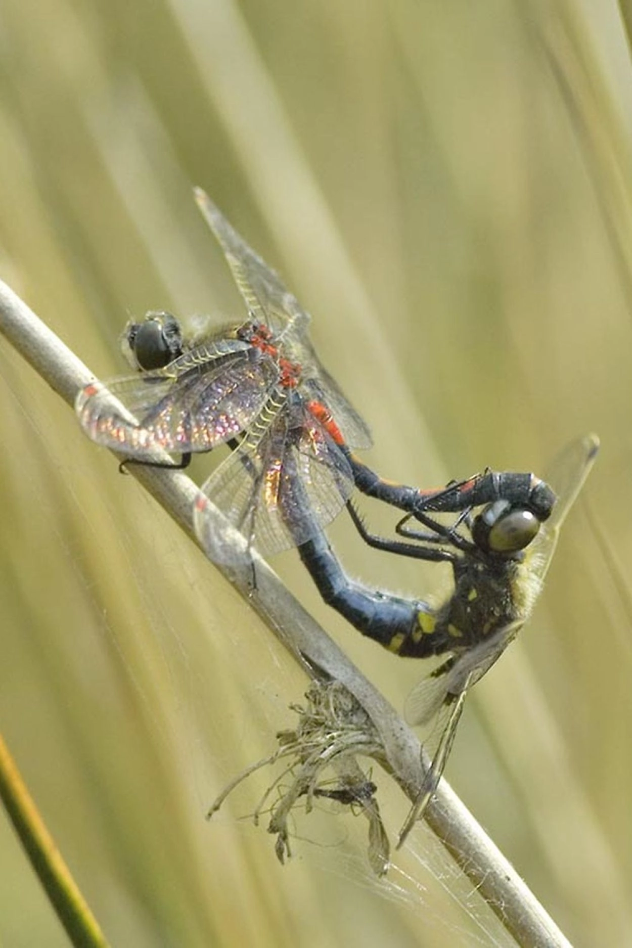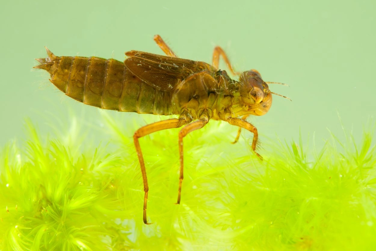 De larven overwinteren twee keer. Uitsluipen gebeurt vroeg: van begin april tot half juni. In jaren met een uitzonderlijk warme herfst kunnen incidenteel larven uitsluipen die eigenlijk zouden moeten overwinteren. De larvenhuidjes zijn te vinden tot op enkele decimeters hoogte in de oevervegetatie. Het eierleggende wijfje wordt al of niet door het mannetje bewaakt (zie onder L. dubia) en sleept daarbij de punt van het abdomen door het water in plaats van het af te tippen, zoals bij andere soorten voorkomt (Wesenberg-Lund, 1913). Het leggen geschiedt op plaatsen waar dicht onder de oppervlakte waterplanten groeien.Overgenomen van de soortenbank"