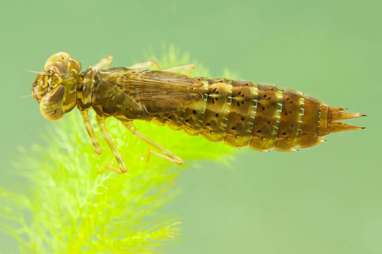 Een jaar, mogelijk soms twee jaar. De (eerste) winter wordt doorgebracht als ei. Uitsluipen gebeurt gedurende een lange periode (geen duidelijke piek), van eind juni tot eind september. De larvenhuidjes zijn te vinden tot op enkele decimeters hoogte op stengels van oever-/ of emerse vegetatie.