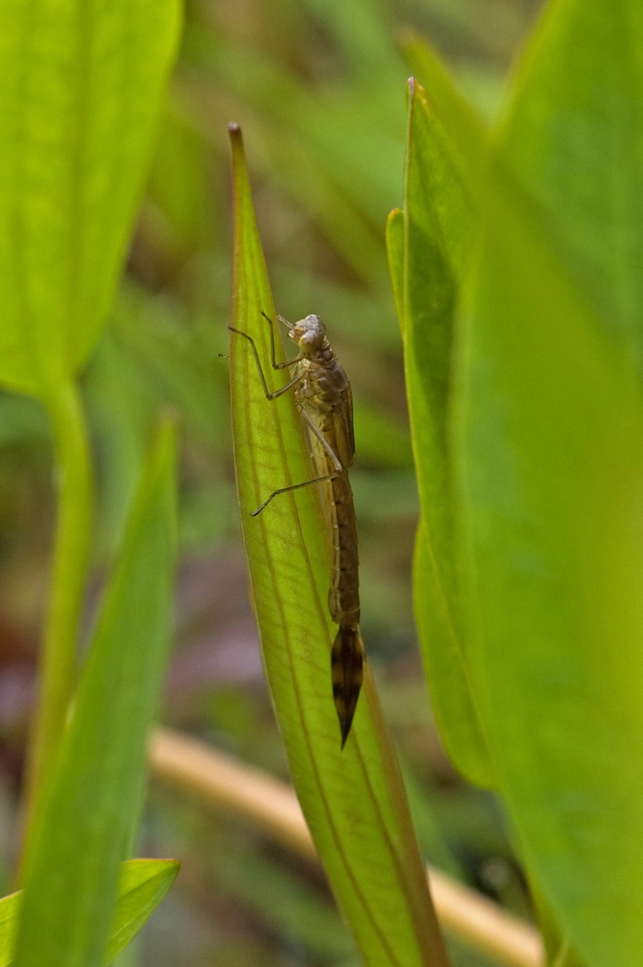 Lengte 23-26 mm, waarvan de achterlijfaanhangsels, procten, 7-8 mm. De procten hebben een puntige uiteinde met banden. Ze hebben een gesteelde vangmasker, prementum, met een lange dunnen hals.Onder de microscoop is te zien dat de achterlijfsegmenten 7 t/m 9 lange dunne haren hebben.