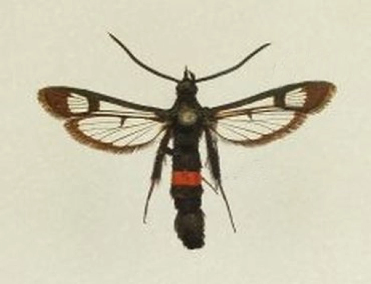 Voorvleugellengte: 9-11 mm. Een goed herkenbare wespvlinder waarvan met uitzondering van de rode band op het achterlijf, het lichaam, het staartpluimpje, de poten en de antennen geheel zwart gekleurd zijn. Ook de voorvleugel is vrijwel geheel zwart, alleen het veld in het vleugeluiteinde, dat relatief breed is, heeft een donkerbruine kleur. De palpen zijn zwart behaard, bij het mannetje deels ook wit.