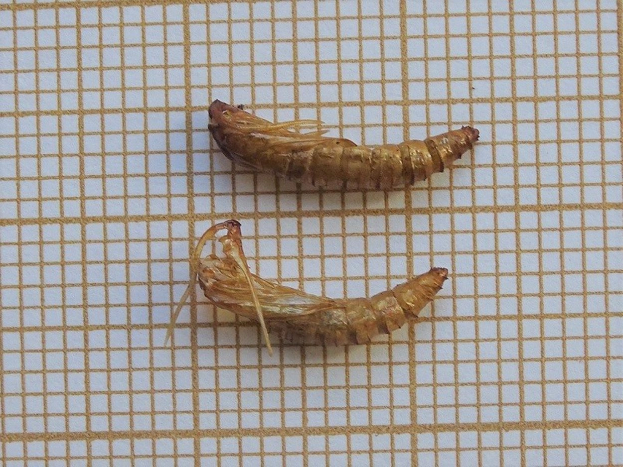 Tot 20 mm; lichaam vrij plomp, gewoonlijk licht gezwollen achter de kop, wit met onduidelijke, bleekgele vlekjes; nek- en anaalschild op resp. segment een en dertien geelachtig bruin; kop roodachtig bruin, gewoonlijk voor een deel in het lichaam teruggetrokken.