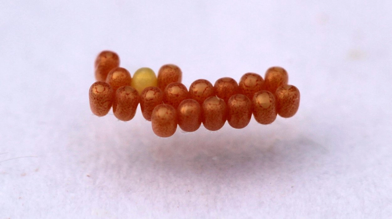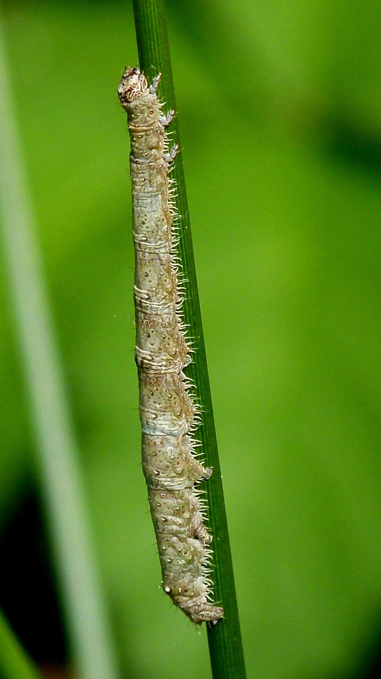 Tot 37 mm; vrij dik, versmald naar de kop; onderzijde afgeplat; lichaam varieert in kleur van groenachtig of geelachtig bruin tot purperachtig bruin met langs de onderzijde van de flanken een franje van haarachtige filamenten; segment acht met een paar extra buikpoten; kop grijsachtig bruin met donkerder tekening.