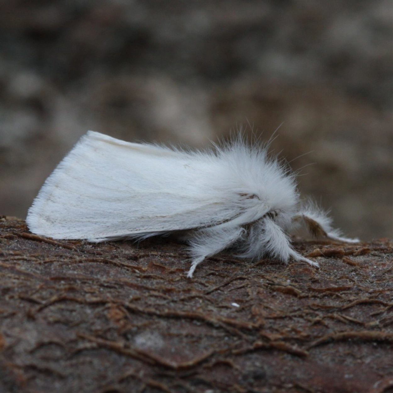 Voorvleugellengte: ♂ 16-20 mm, ♀ 18-19 mm. De bovenzijde van de vleugels is enigszins zijdeachtig en zuiver wit, hoewel het mannetje soms enkele kleine donkere vlekjes bij de binnenrandhoek van de voorvleugel heeft. De bovenkant van het achterlijf van het mannetje is van voren wit maar aan het uiteinde diep chocolade- of roestbruin van kleur en sterk behaard. Bij het vrouwtje is de hele bovenkant van het achterlijf bruinachtig grijs met aan het uiteinde een grote bolvormige toef donkerbruine haren. Bij verstoring tonen de vlinders vaak het uiteinde van het achterlijf door het omhoog te steken of om te krullen. De antennen van het mannetje zijn sterk geveerd, die van het vrouwtje slechts licht geveerd.