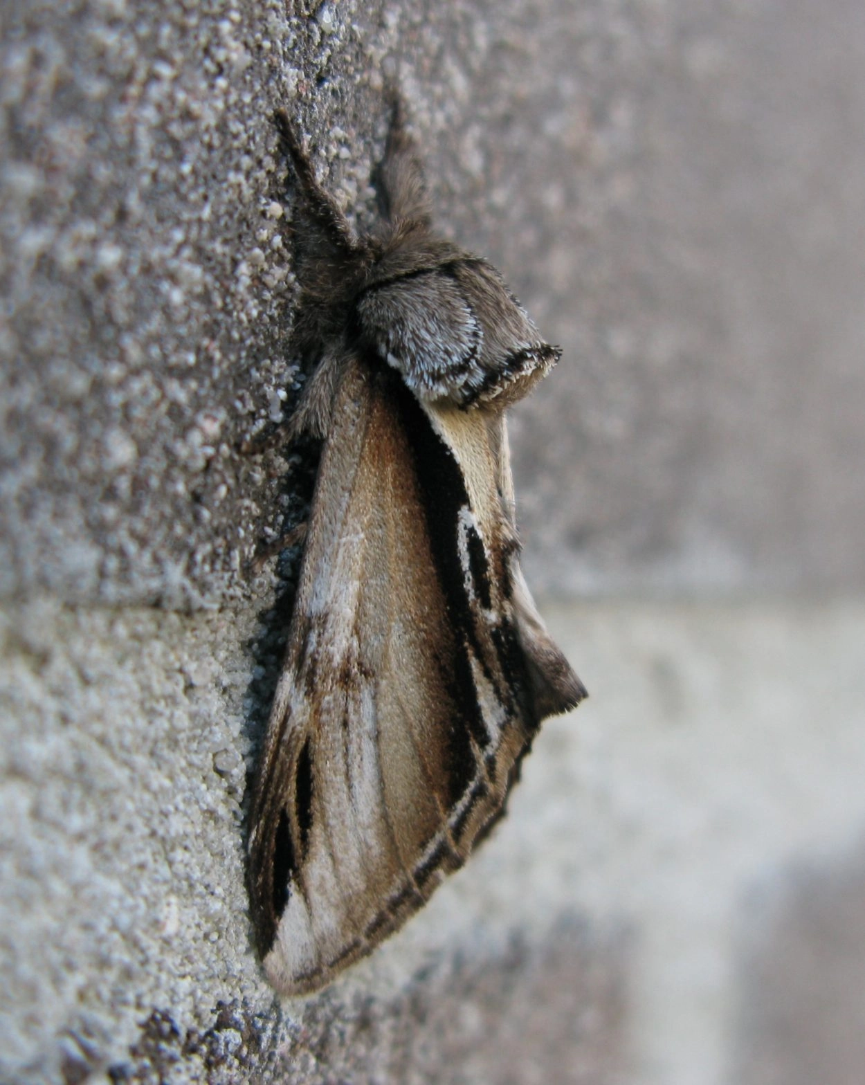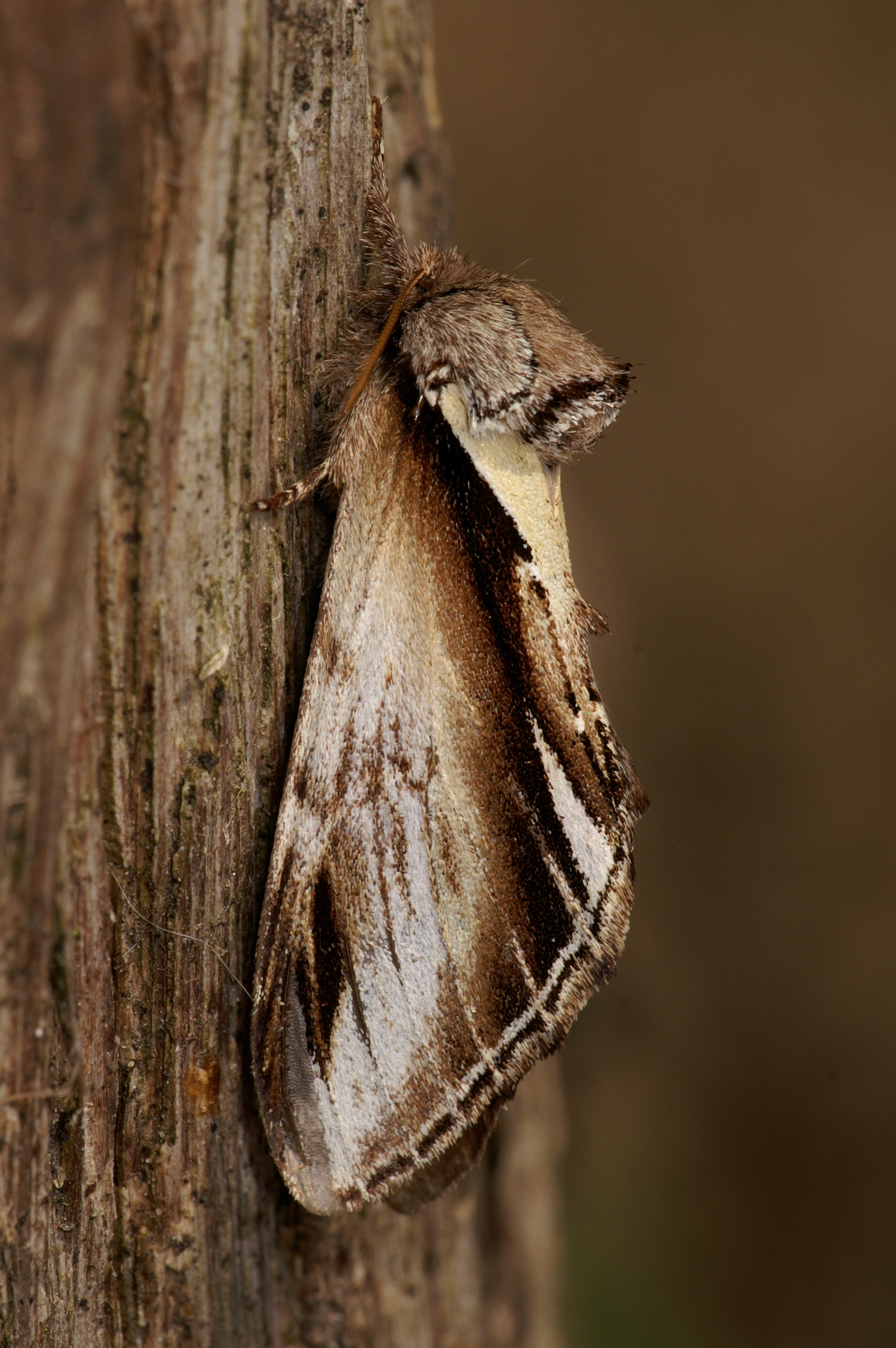 Brandvlerkvlinder (Pheosia tremula).N.B.: vergelijk behalve de uiterlijke kenmerken ook de tijd van het jaar waarin de rupsen voorkomen, het habitat en de waardplant(en).
