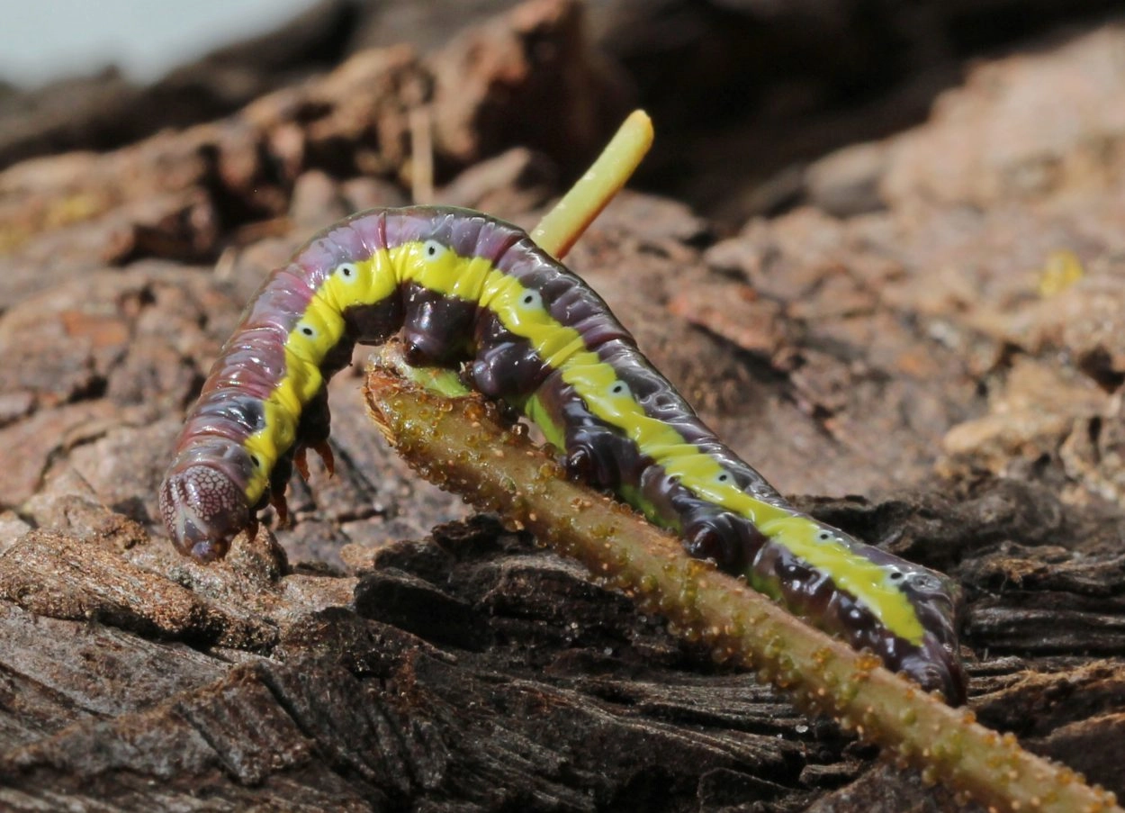 Tot 40 mm; lichaam zeer glanzend als gevernist; kleur grijs tot purperachtig bruin met over de rug een brede zwartachtige middenband en op de flanken een brede, heldergele lengteband; segment elf met een zwarte, puntige bult; kop witachtig met een netwerk van zwartachtige lijntjes.