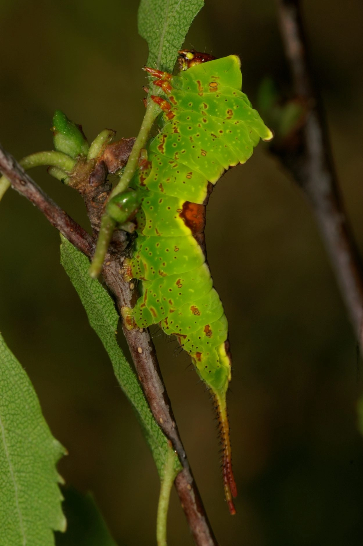 Tot 40 mm; dik, versmald naar het achtereind, dat in twee lange staarten uitloopt; lichaam groen met op de rugzijde van de segmenten vier tot elf een witgezoomde, donker purperachtig bruine zadelvormige band en op de rugzijde van de segmenten een en twee een uitgerekte driehoekigge vlek; segment twee met een klein puntig bultje op de rug; kop donker roodachtig bruin.