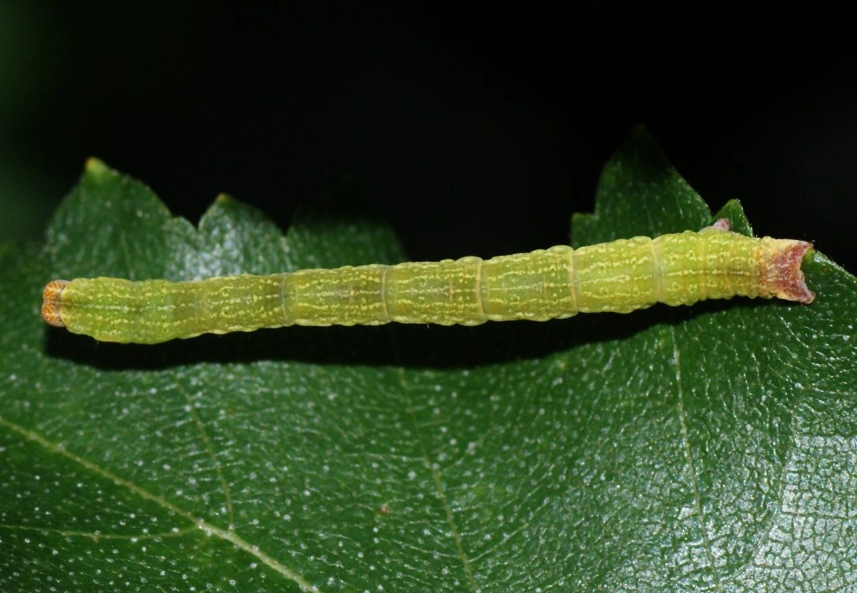 Tot 23 mm; lichaam roodachtig bruin tot grijsachtig purper met lichtgrijze lengtestrepen, of helder groen met geelachtige lengtestrepen; kop bruin.