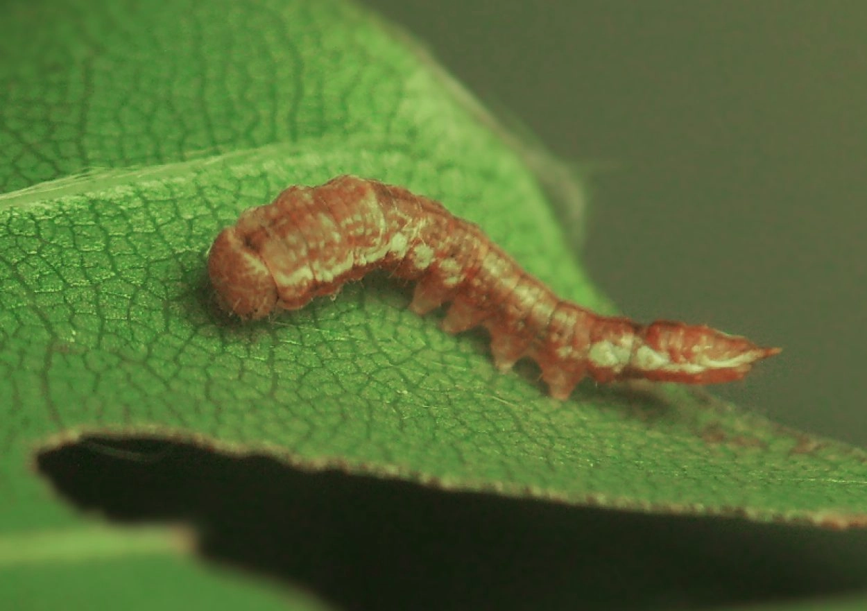 Tot 20 mm; vrij slank, naar de spitse staart versmald; lichaam roodachtig bruin met een bruinachtig witte, zadelvormige vlek op de rugzijde van de segmenten vijf tot tien; segment drie met een gevorkte wrat op de rugzijde; onderzijde geelachtig wit; kop bleek roodachtig bruin met donkerder tekening, ingesneden.