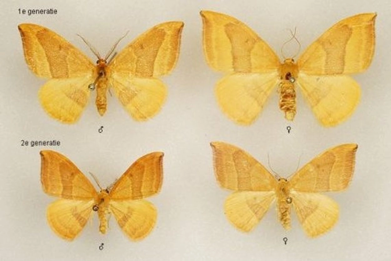 Gele eenstaart (Watsonalla binaria).N.B.: vergelijk behalve de uiterlijke kenmerken ook de tijd van het jaar waarin de rupsen voorkomen, het habitat en de waardplant(en).