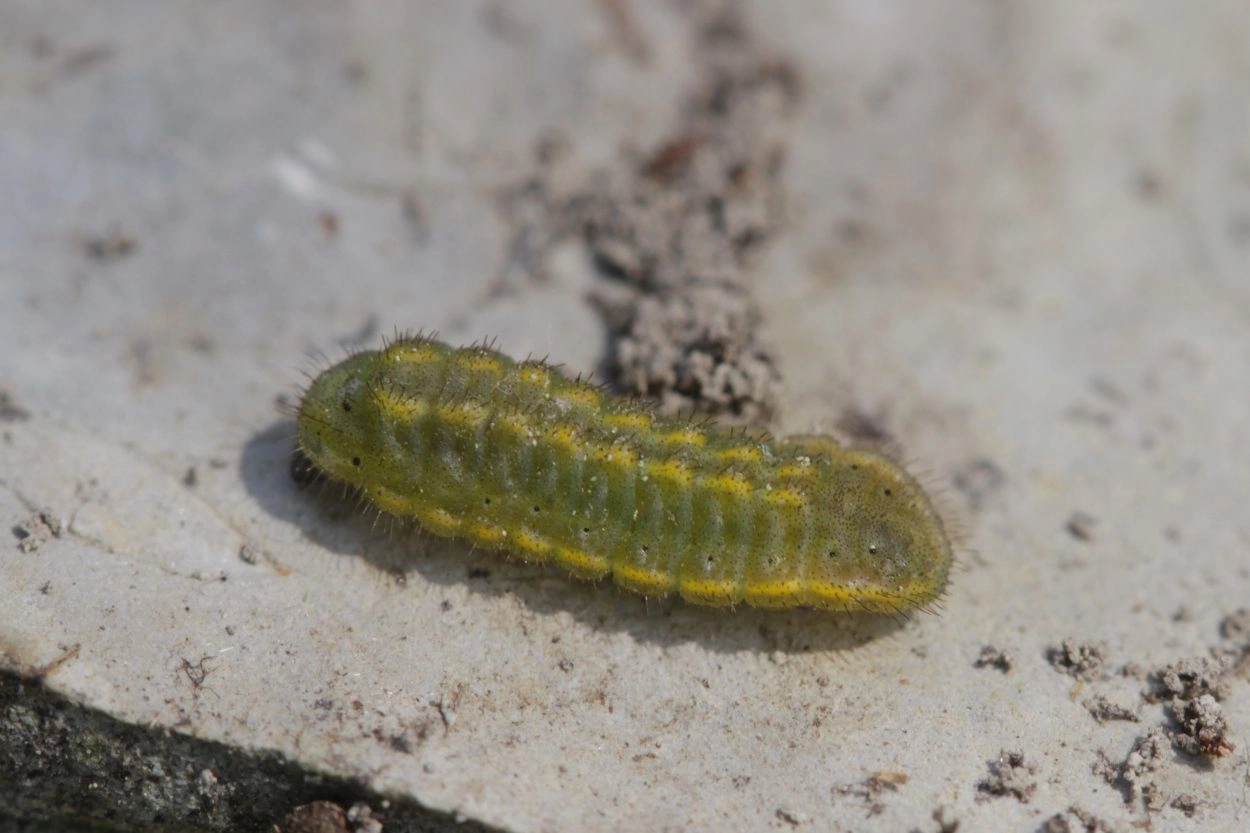 Tot 16 mm; vrij dik, naar de uiteinden versmald en afgeplat naar de randen; lichaam groen met twee gele lengtebanden over de rug en onder de zwarte spiracula een dubbele gele streep; kop glimmend zwart, in het lichaam teruggetrokken.