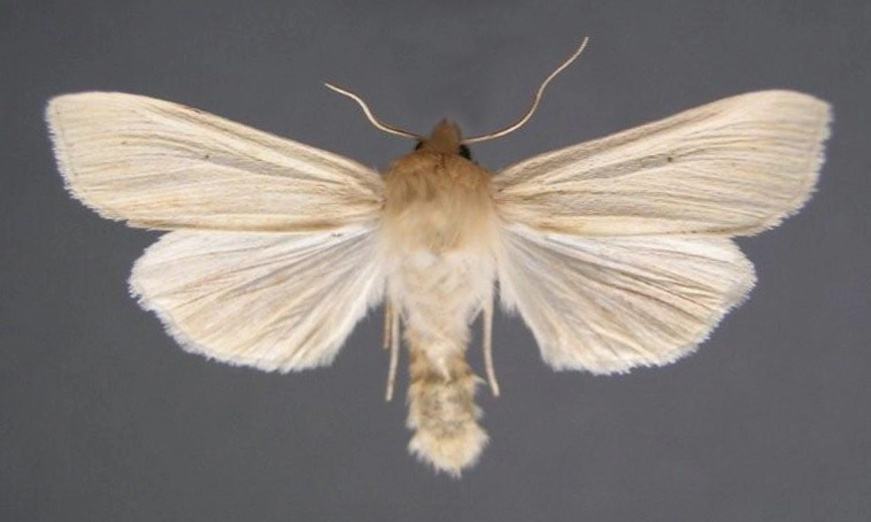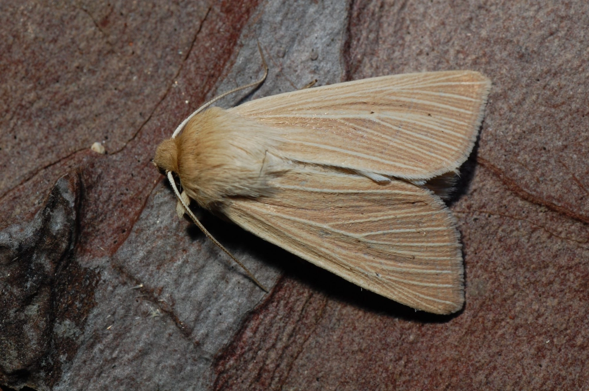 Voorvleugellengte: 14-17 mm. De voorvleugel is vrij smal en loopt spits toe, maar heeft geen uitstekend puntje aan de vleugelpunt. De grondkleur is helder strokleurig of roodachtig bruin, soms met bruine strepen. De tekening bestaat verder nagenoeg uitsluitend uit lichte aders; op de plaats van de buitenste dwarslijn liggen geen of slechts weinig zwarte stippen. Op de kraag is geen lijn zichtbaar. De achtervleugel is doorgaans witachtig, soms fijn grijs bespikkeld en heeft geen middenvlek; in sommige gevallen is de achtervleugel uitgebreider grijs bespikkeld (vooral bij het vrouwtje) of zijn er zelfs zwarte streepjes aanwezig. Vlinders met een donkere voorvleugel en een rookgrijze achtervleugel hebben vaak uitgebreide zwartachtige strepen aan de onderzijde van de voorvleugel; meestal betreft dit exemplaren van de tweede generatie.