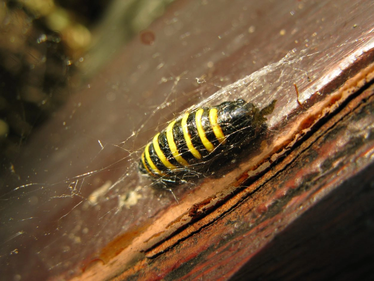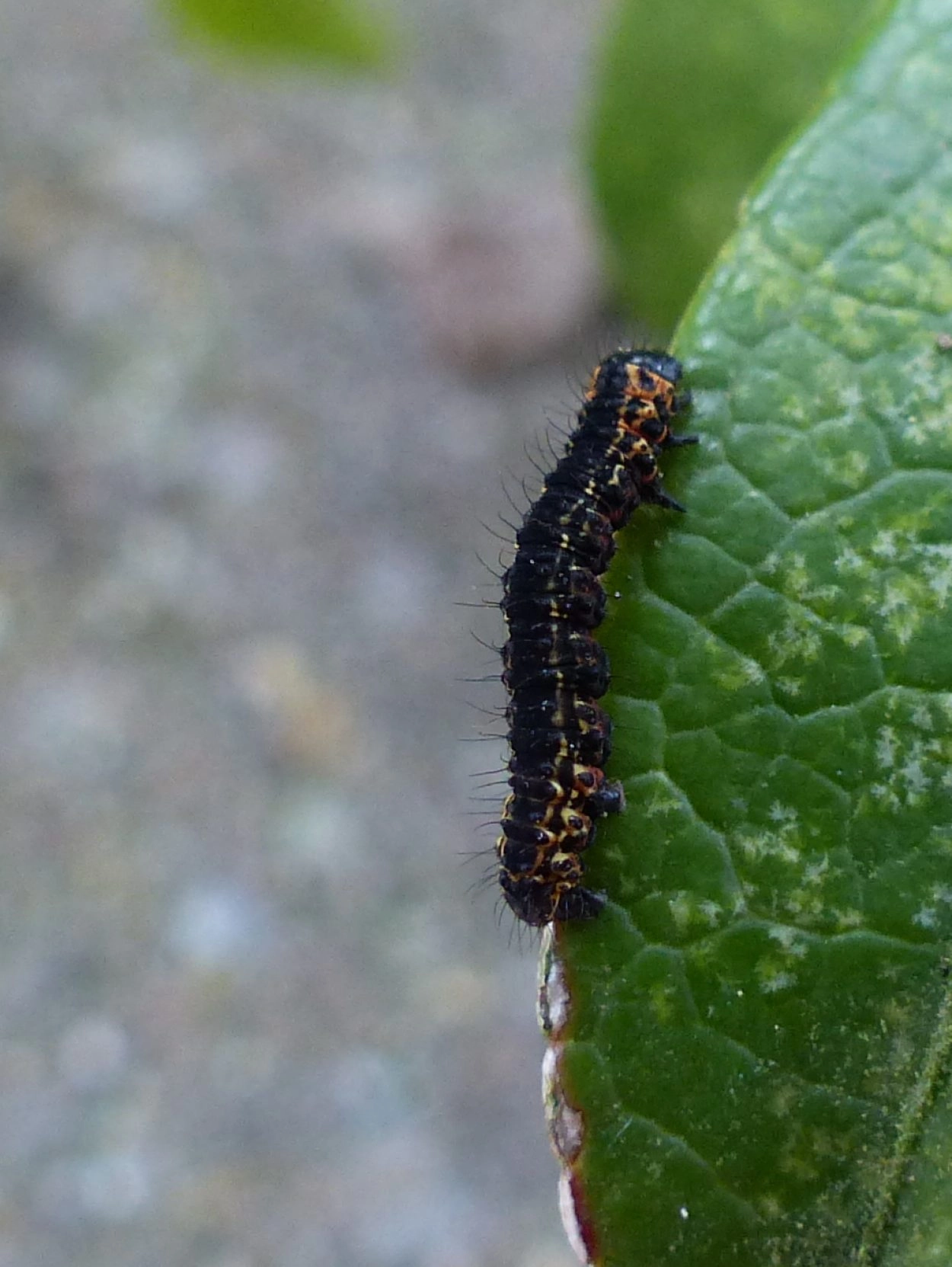 Tot 32 mm; lichaam bleek geelachtig wit met uitgebreide tekening van zwarte vlekken, die soms samenvloeien en de rups dan een bijna zwart uiterlijk geven; over de spiracula een brede, oranjerode lengtestreep; segmenten een tot drie soms met een lichtrode zweem; kop glimmend zwart.
