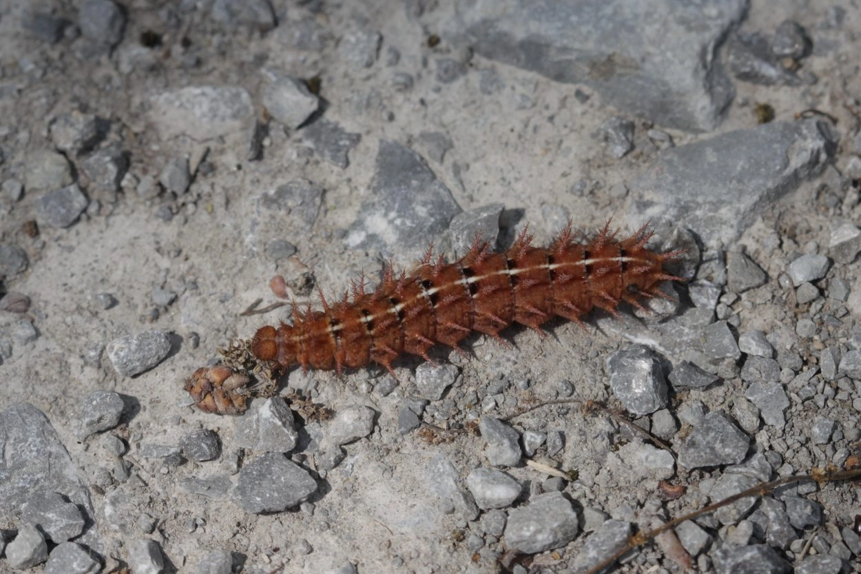 Tot 38 mm; lichaam roodachtig bruin of donkerbruin met een witte lengtestreep over de rug die met een aantal driehoekige, zwarte vlekjes is aangevuld; doorns bleek roodachtig bruin of roze; kop roodachtig bruin.