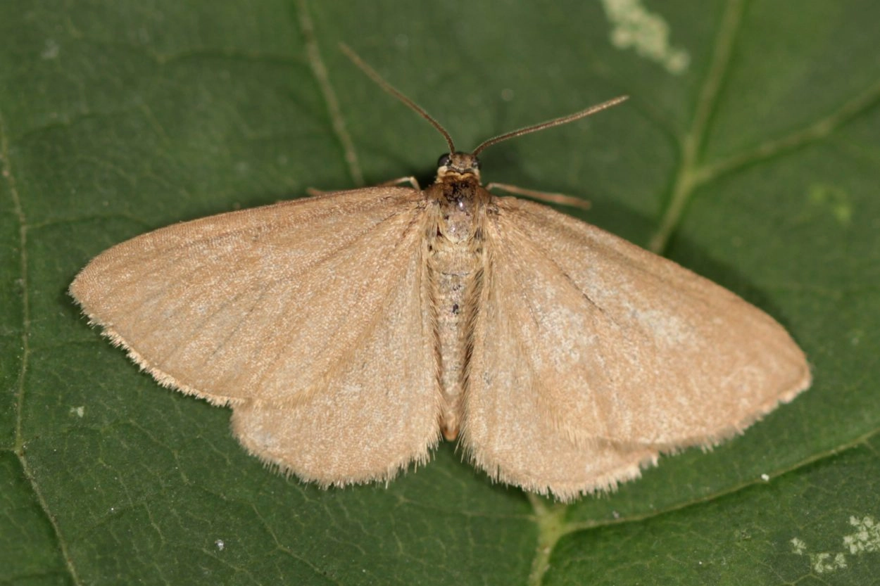 Voorvleugellengte: 9-11 mm. Goed te herkennen aan de effen licht- tot vaalbruine vleugels zonder verdere tekening. In Nederland komt echter vrijwel uitsluitend de zwarte melanistische vorm voor, die in het buitenland juist niet voorkomt.