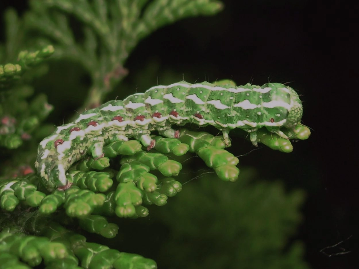 Tot 38 mm; lichaam groen met over de rug een brede witte middenstreep en aan weerszijden daarvan een rij licht gebogen, witte vlekken; onder de spiracula een golvende witte lengtestreep met op iedere golftop een kastanjebruine vlek; kop groen met lichtere tekening.