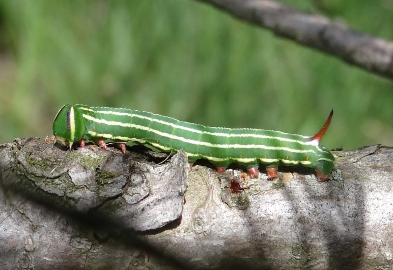 Tot 80 mm; lichaam groen met zwartachtig schuine strepen; over de rug een brede, roodachtig bruine middenband die soms tot de spiracula is uitgebreid; over de rug ook nog drie geelachtig witte lengtestrepen die soms door de roodachtig bruine band worden overschaduwd; onder de spiracula een gebroken geelachtig witte lengteband; spiracula oranje met zwarte rand. De jonge rupsen zijn groen met geelachtig witte strepen