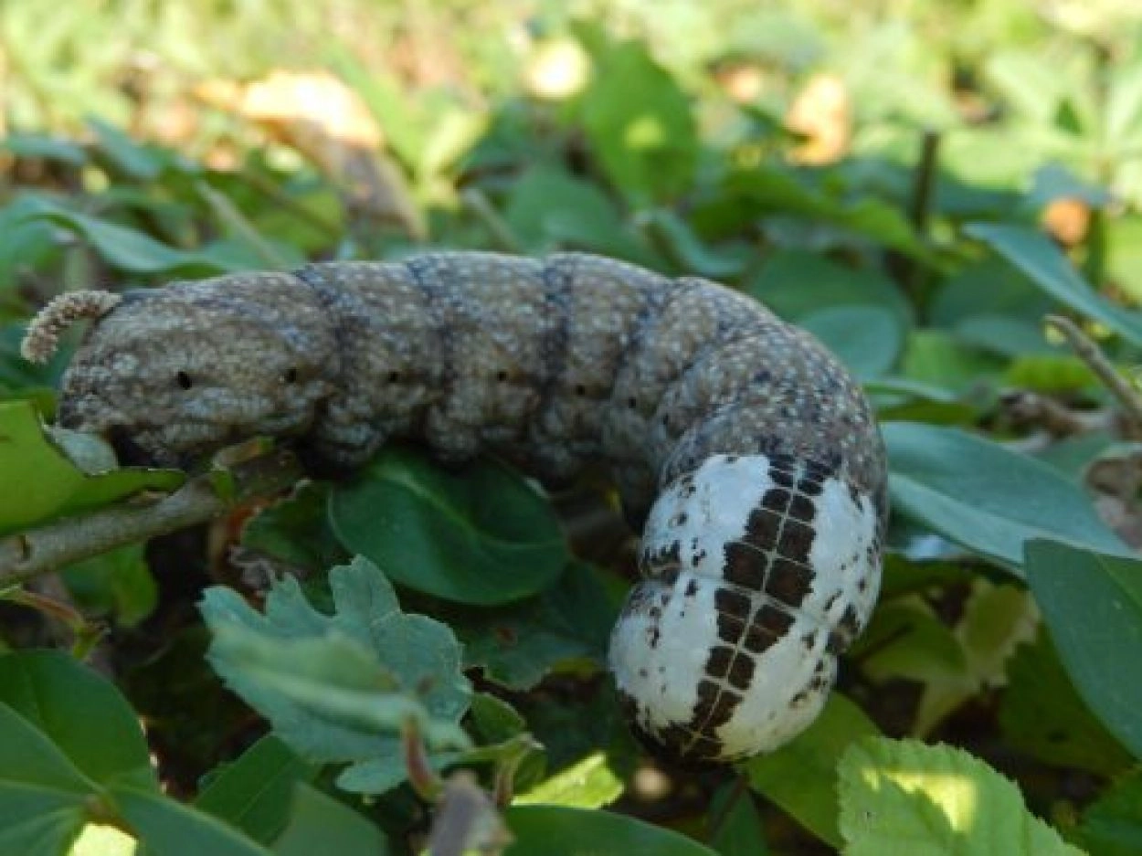 Lengte tot 130 mm. Zeer variabel in kleur en tekening, met bruine, geelachtige en groene vormen. De meeste Europese rupsen behoren tot de gele vorm, die purperachtig zwarte vlekken op de rug heeft en donkere blauwe of purperachtig bruine diagonaalstrepen boven de spiracula draagt; de hoorn op het elfde segment is korrelig en S-vormig gebogen; kop geel met twee brede, zwarte strepen.