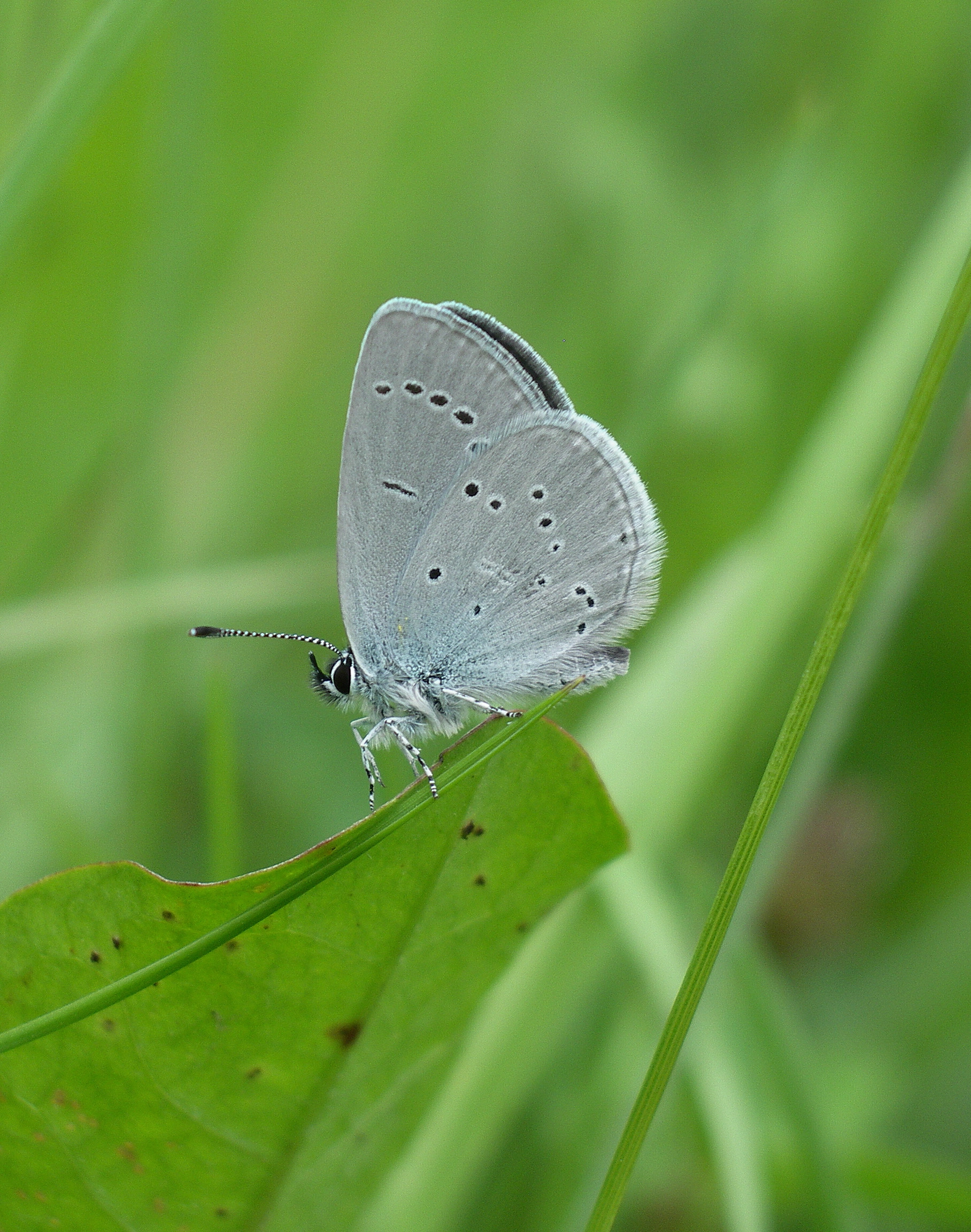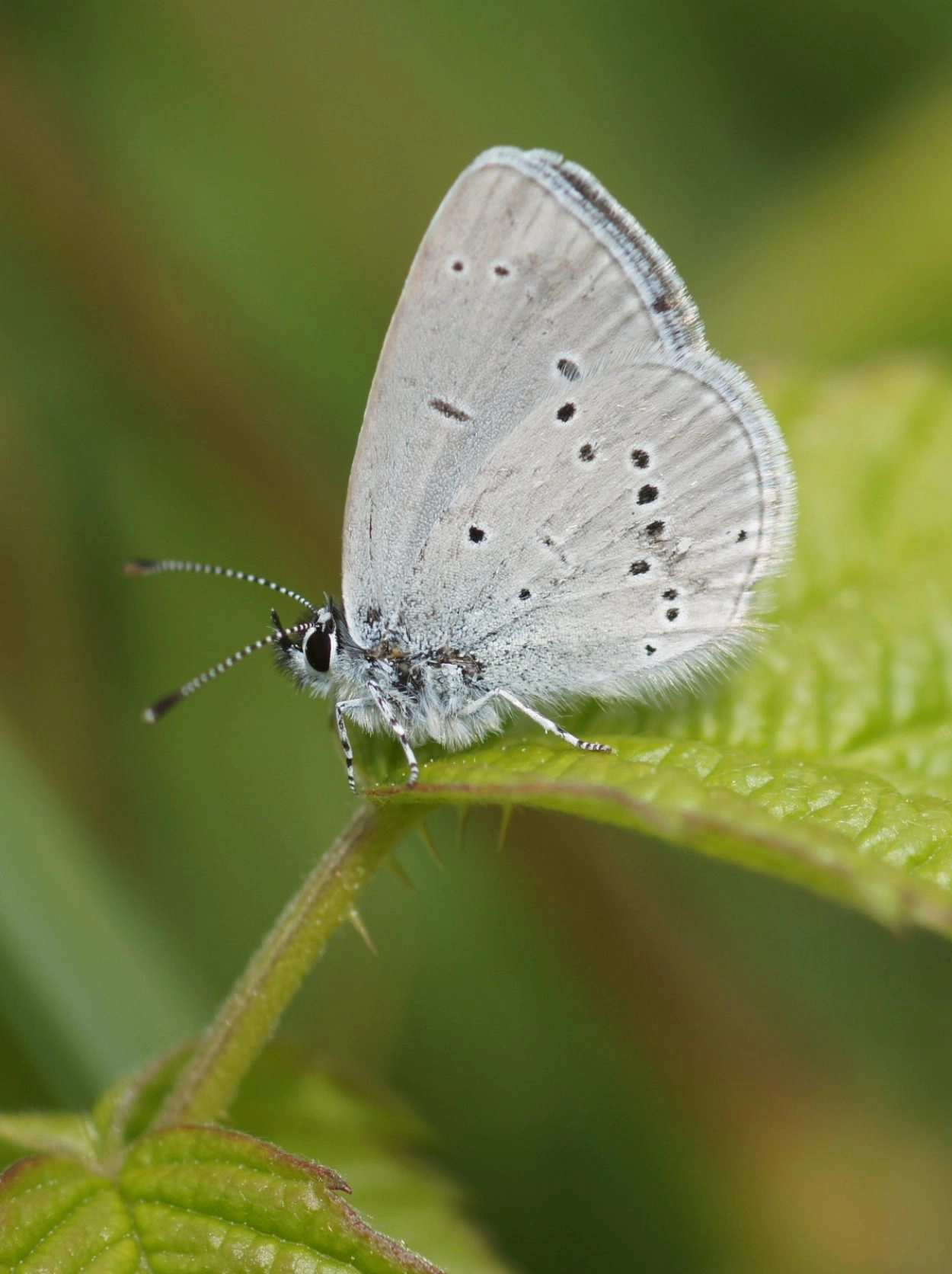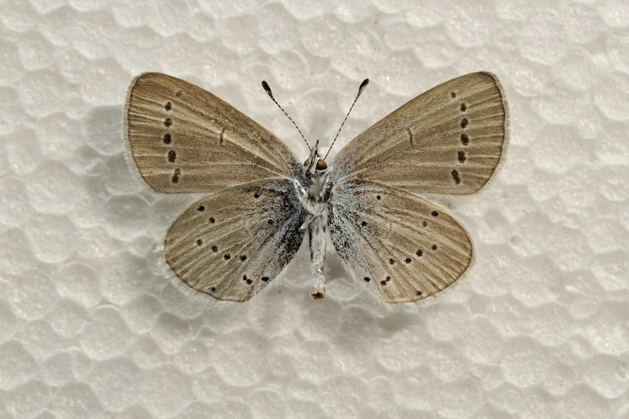 Voorvleugellengte: circa 9 mm. De bovenkant van de vleugels is bruin en bij het mannetje is deze bij de wortel blauw bestoven. De onderkant van de vleugels is lichtgrijs met kleine zwarte, witgeringde vlekken. Het is het enige kleine blauwtje zonder oranje vlekjes op de onderkant. De vlinder is bovendien zo klein dat hij nauwelijks met andere soorten verward kan worden.