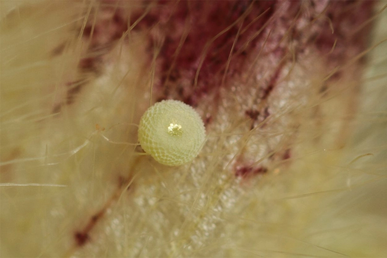 Het vrouwtje zet de eitjes afzonderlijk af op de jonge bloemen of bloemknoppen. Meestal wordt een eitje afgezet aan de harige basis van de bloemkelk. Daarna wrijft het vrouwtje met het achterlijf over de bloemen. Mogelijk is dit om een geurspoor achter te laten zodat het bloemhoofdje niet door andere vrouwtjes wordt gebruikt. Toch worden geregeld bloemhoofdjes gevonden met meerdere eitjes daarop.
