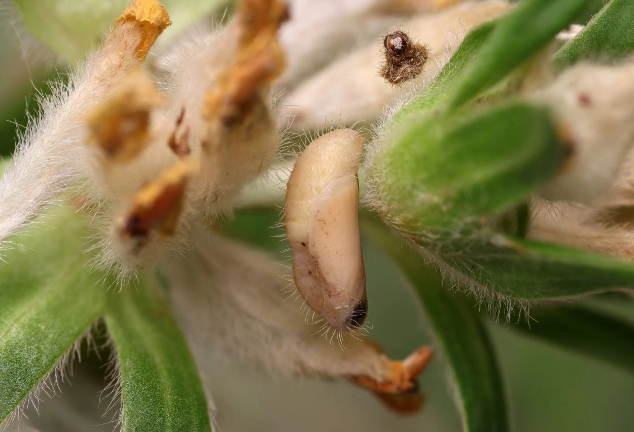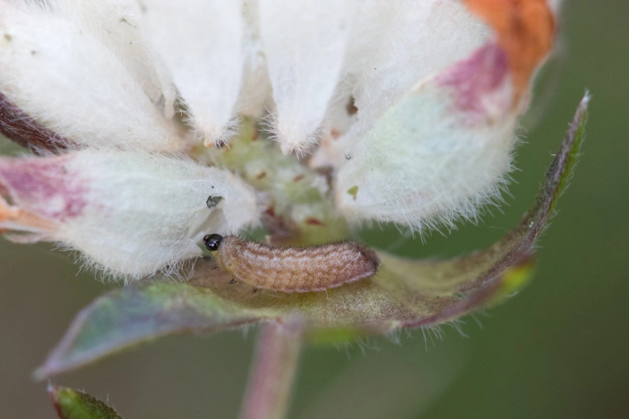 Net uit het eitje gekropen eet de rups een gaatje in de bloembodem en voedt zich met het vruchtbeginsel en de zaden. De lege eischaal blijft op de bloemknop achter en kan de hele zomer gevonden worden. Ervaren waarnemers inventariseren de soort aan de hand van deze ei-restanten. De opening in het vruchtbeginsel wordt zorgvuldig verborgen met uitwerpselen en spinsel. Als het vruchtbeginsel op is gaat de rups naar een andere bloem. De oudere rups eet ook bloemen en leeft aan de buitenzijde van het vruchtje, maar blijft er een verborgen leefwijze op na houden. De rupsen kruipen van de ene naar de andere bloem en als daar al een soortgenoot aanwezig is, eet de grotere de kleinere op. Rupsen moeten snel groeien want de wondklaver bloeit maar enkele weken. Ze zijn aantrekkelijk voor mieren en worden soms meegenomen naar het nest, waar de rups vervolgens verpopt. Rupsen die op de waardplant blijven, overwinteren in de strooisellaag, bijvoorbeeld tussen afgestorven delen van de waardplant. Sommige rupsen verpoppen zich nog hetzelfde jaar en brengen een partiële tweede generatie voort, maar de meeste verpoppen in het voorjaar. Ook de pop is aantrekkelijk voor mieren en wordt nogal eens meegenomen.