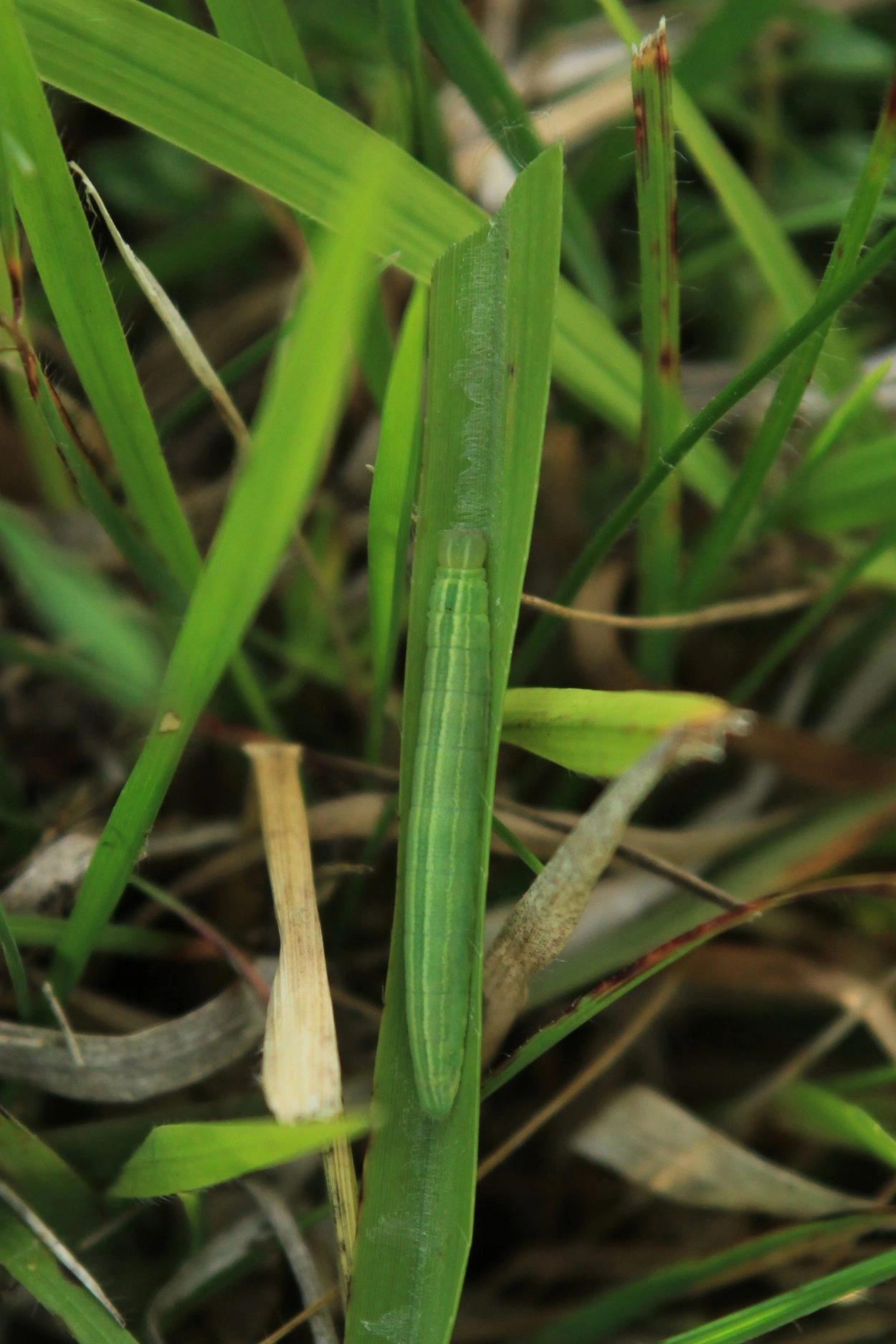 Tot 24 mm; naar beide uiteinden smal toelopend; lichaam groen met een licht afgezette donkergroene streep over het midden van de rug met aan weerszijden een lichte groenachtig gele streep; op beide flanken loopt een geelachtig witte band; de grote kop is bleek groenachtig bruin.