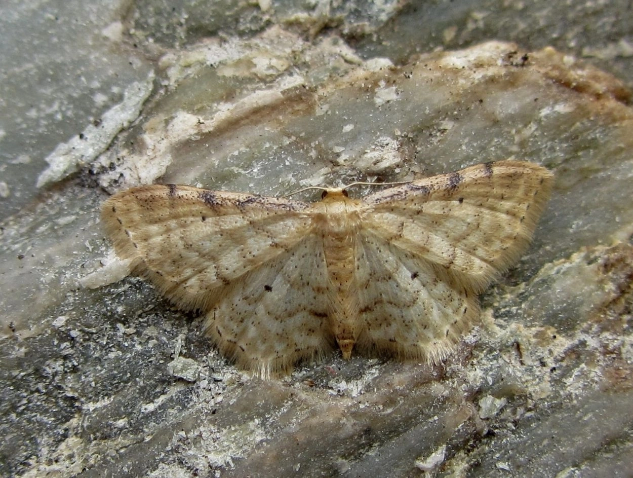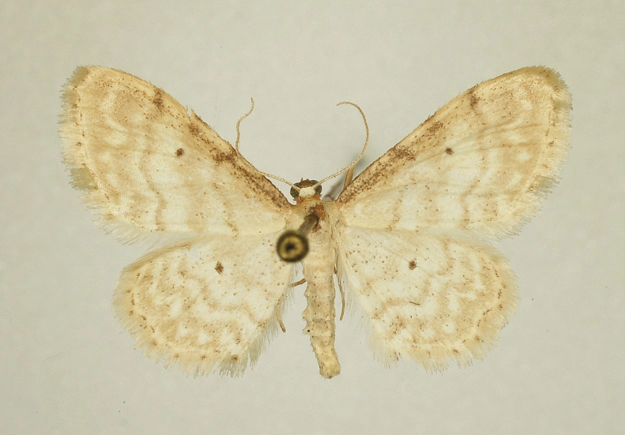 Voorvleugellengte: 9-11 mm. De vleugels van deze spanner zijn crèmekleurig wit. De dwarslijnen zijn grijsachtig lichtbruin van kleur. Langs de voorrand van de voorvleugel, waarlangs zich vanaf de vleugelwortel tot ongeveer halverwege de vleugel een dichte donkere bespikkeling bevindt, zijn deze dwarslijnen extra duidelijk. Zowel op de voor- als op de achtervleugel bevindt zich een kleine, maar goed zichtbare zwarte middenstip. De franjelijn van de vleugels bestaat uit fijne donkere streepjes; haaks daarop zijn soms korte streepjes in de franje zichtbaar (het beste te zien met een loep). De franje heeft een lichte, geelachtig tot goudkleurige tint.