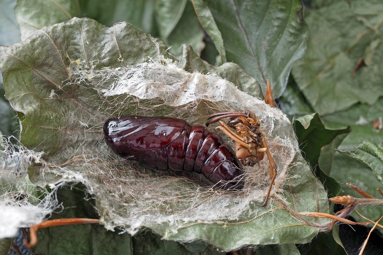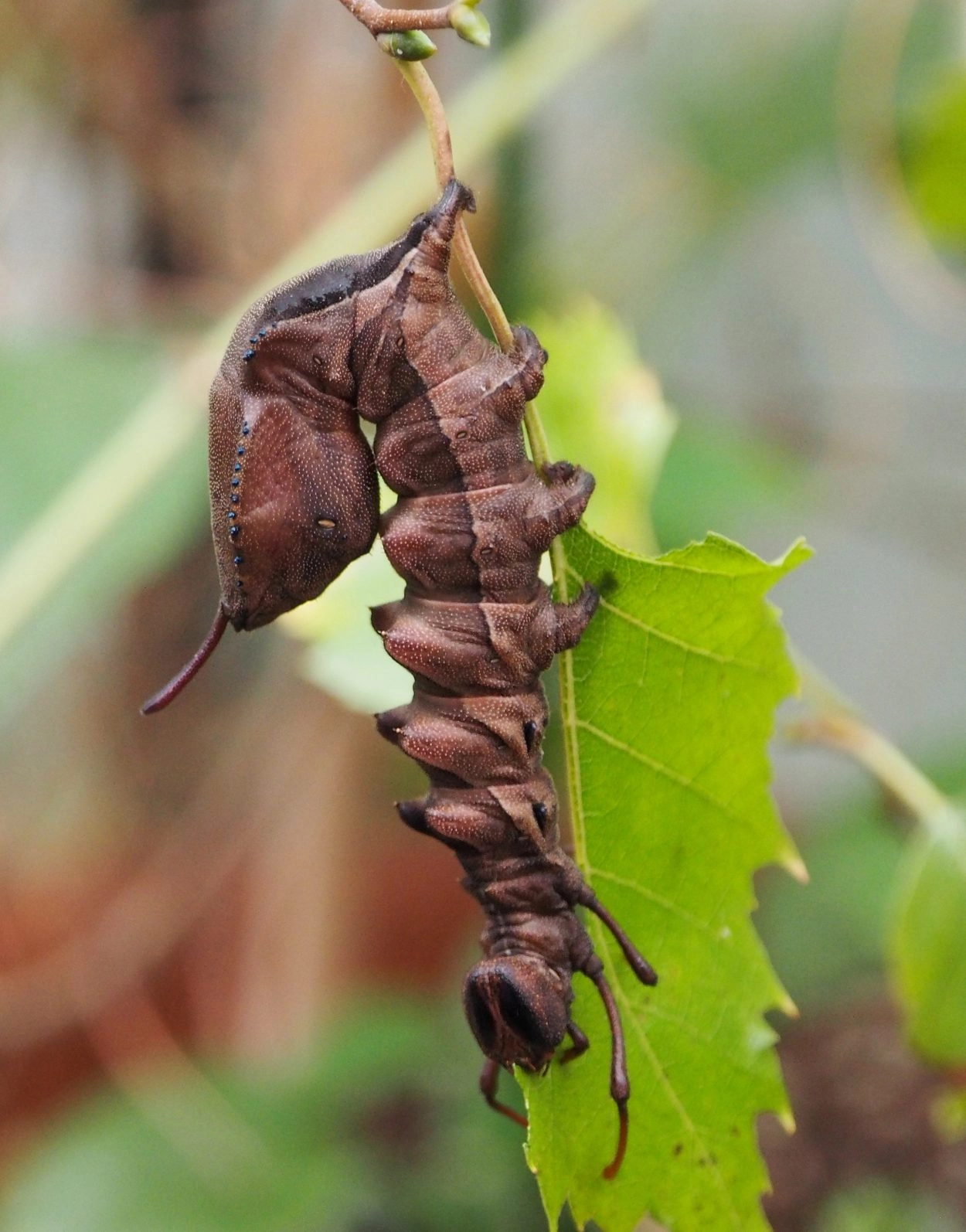 Tot 60 mm; lichaam vrij slank, versmald naar de kop; de achterste segmenten enigszins afgeplat, met op de flanken van het laatste segment een paar korte knotsvormige steeltjes (staartspitsen), die samen met de sterk verlengde poten van de thorax de rups min of meer het uiterlijk van een kruisspin geven; de segmenten vier tot acht dragen op de rugzijde dubbel gepunte bulten; kleur roodachtig bruin met een donkerbruine lengtestreep boven de spiraculae; kop groot en roodachtig bruin met zwarte tekening.