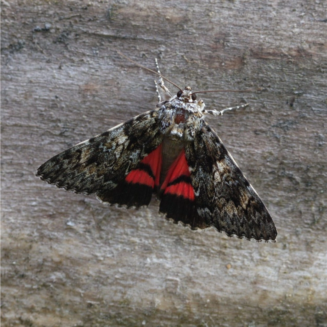 Voorvleugellengte: 26-32 mm. Deze spinneruil is te herkennen aan de vorm van de donkere middenband op de karmozijnrode achtervleugel; de band is minder gebogen dan bij de andere soorten en loopt richting de binnenrand smal toe (doet enigszins denken aan de vorm van een zeepaardje). De voorvleugel is bont getekend en in het wortel- en middenveld bevinden zich verschillende grijsachtig witte vlekken. De buitenste dwarslijn is getand en zwart van kleur; de golflijn is scherp getand.