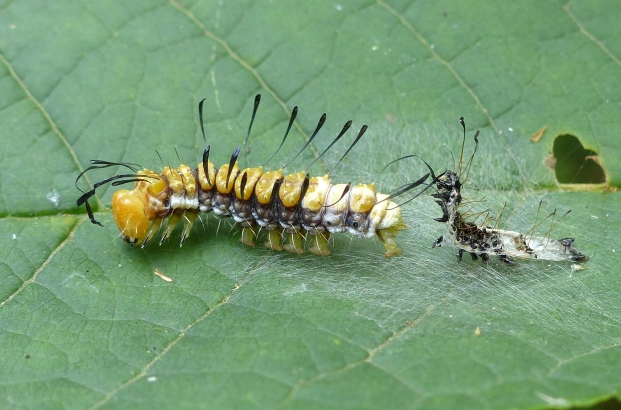 Tot 35 mm; lichaam zwart met op de rug paren van lange, knotsvormige haren die op opvallende, gele dwarsbanden staan ingeplant; kop en poten glimmend zwart. De jonge rupsen missen de gele dwarsbanden en de haren zijn nog niet zo sterk ontwikkeld, maar ze hebben over de rug een lange, grijsachtig witte vlek en lijken hierdoor op uitwerpselen van vogels, wanneer ze gekromd op de bladeren zitten.