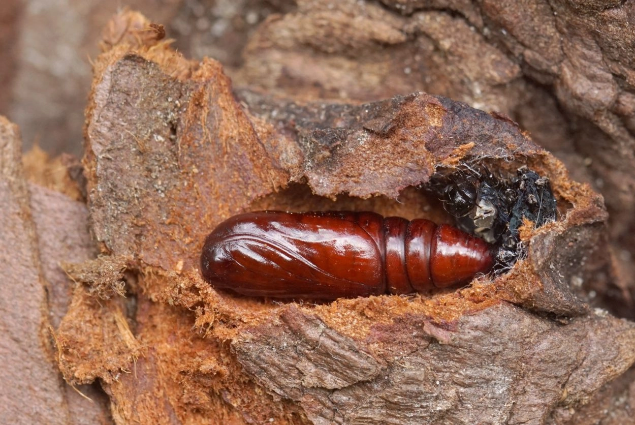 Rups: juni-augustus; rupsen van een eventuele tweede generatie tot in oktober. De opvallende rups rust op de bovenzijde van een blad. De rupsen knagen een holte in dood hout en maken de uitgang dicht met zijde en houtsplinters. De soort overwintert als pop in deze holte.