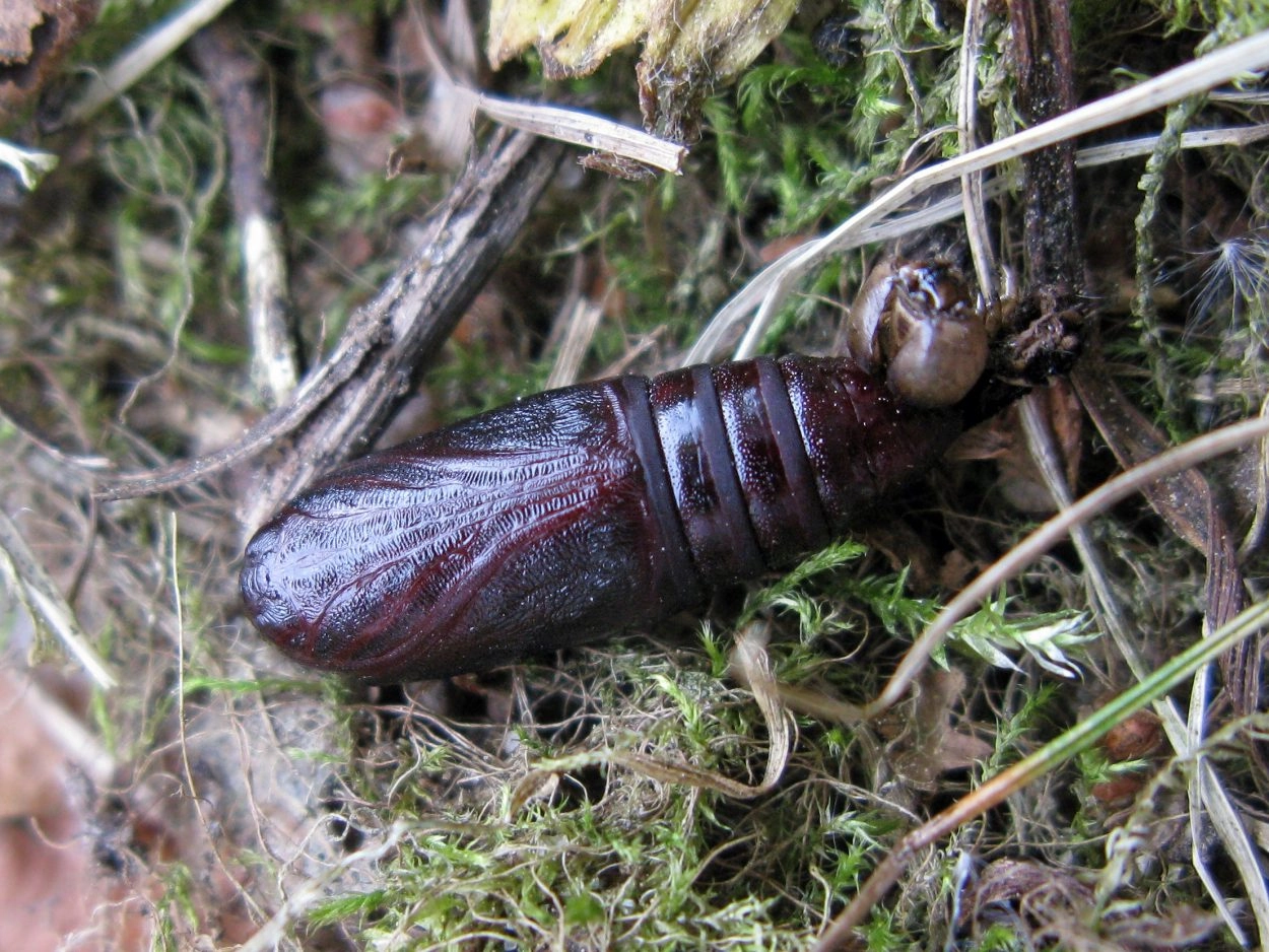 Tot 45 mm; lichaam varieert in kleur van groen tot roodachtig bruin of donker purperachtig bruin met twee brede, gele lengtebanden over de rug en een brede, gele lengteband over de spiracula; kop bruin of groenachtig bruin.