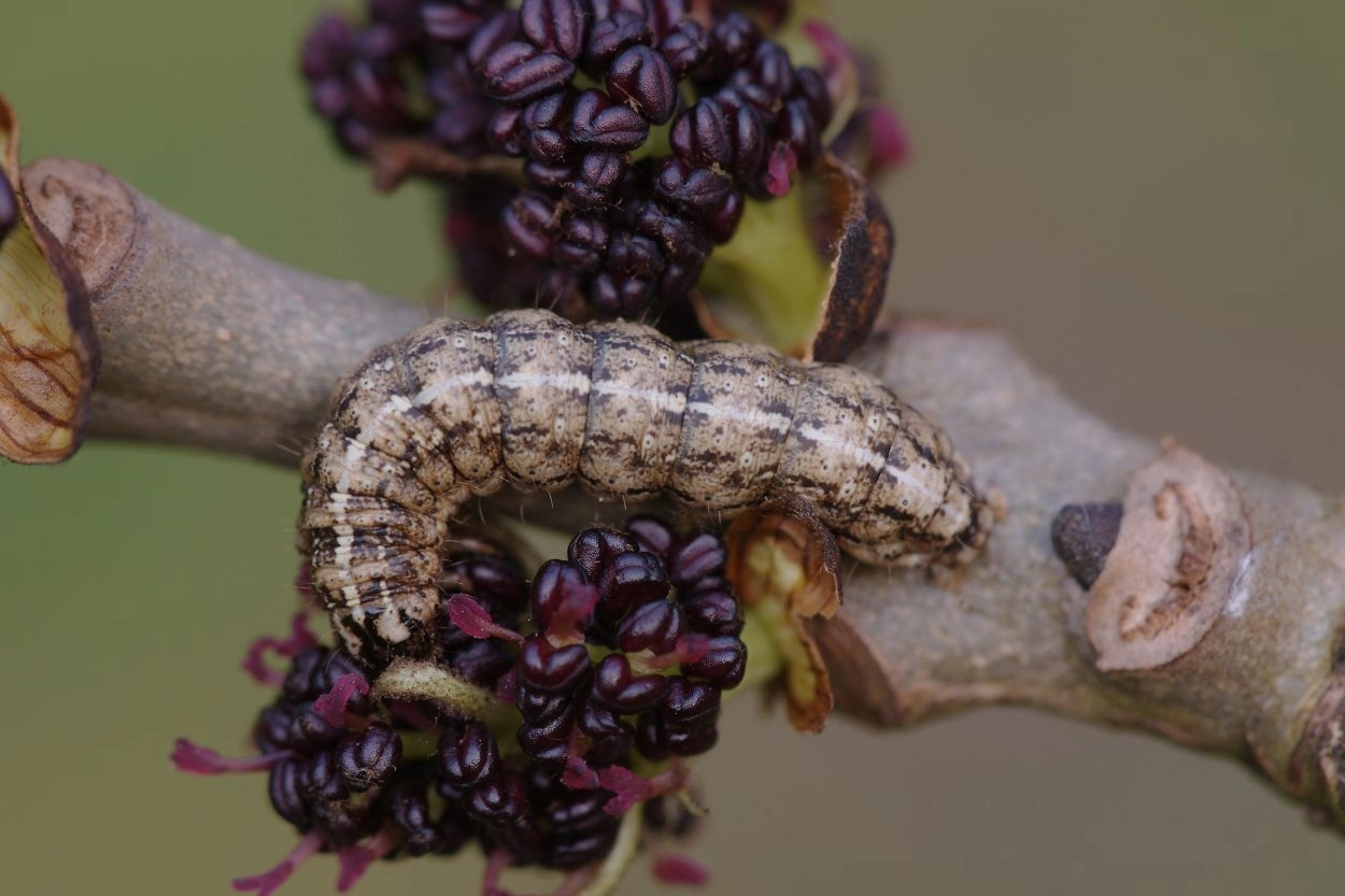Tot 30 mm; lichaam grijs met op de rug zwartachtig grijze spikkels; over het midden van de rug een rij witachtige vlekken met aan weerszijden een rij minder duidelijke lichte vlekjes; boven de lijn van de spiracula een golvende zwarte lengtestreep; kop zwart met grijsachtig bruine tekening.