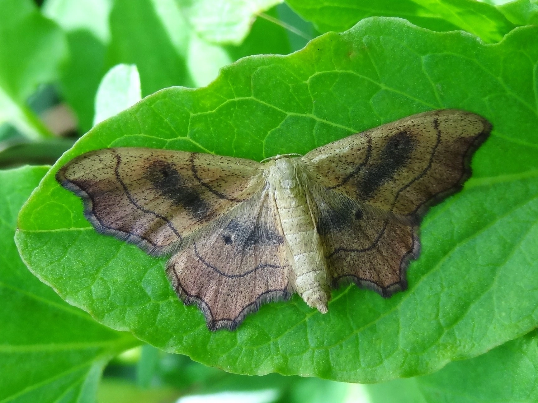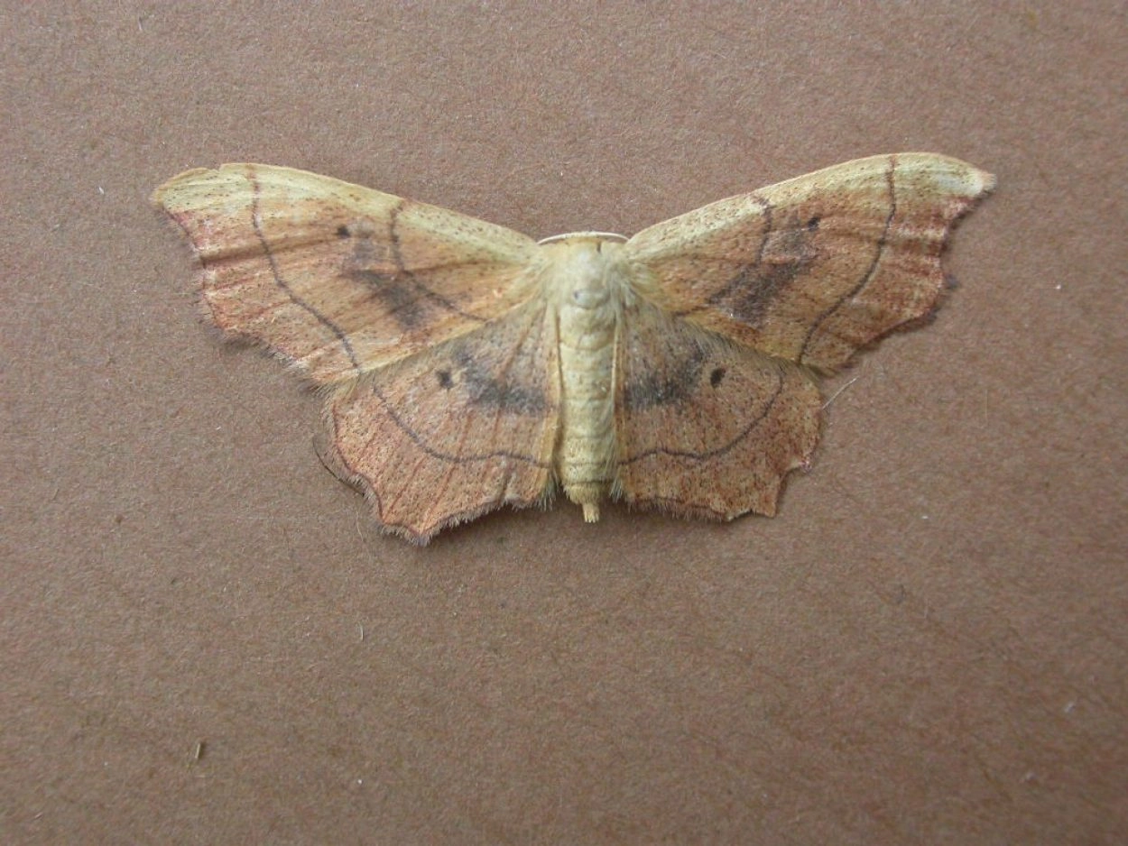 Voorvleugellengte: 11-13 mm. Goed te herkennen aan de grof geschulpte achterrand van de vleugels, de scherpe fraai golvende centrale dwarslijnen, de duidelijke vleugeladers en de duidelijke middenstip op zowel de voor- als de achtervleugel. Het mannetje is zandkleurig tot lichtbruin, het kleinere vrouwtje is meer oranje getint en donkerder. Ook loopt bij het vrouwtje een duidelijke brede middenschaduw over de voor- en achtervleugel; bij het mannetje is deze vaag of nauwelijks zichtbaar. De franje langs beide vleugels is opvallend geblokt. Er is weinig variatie.