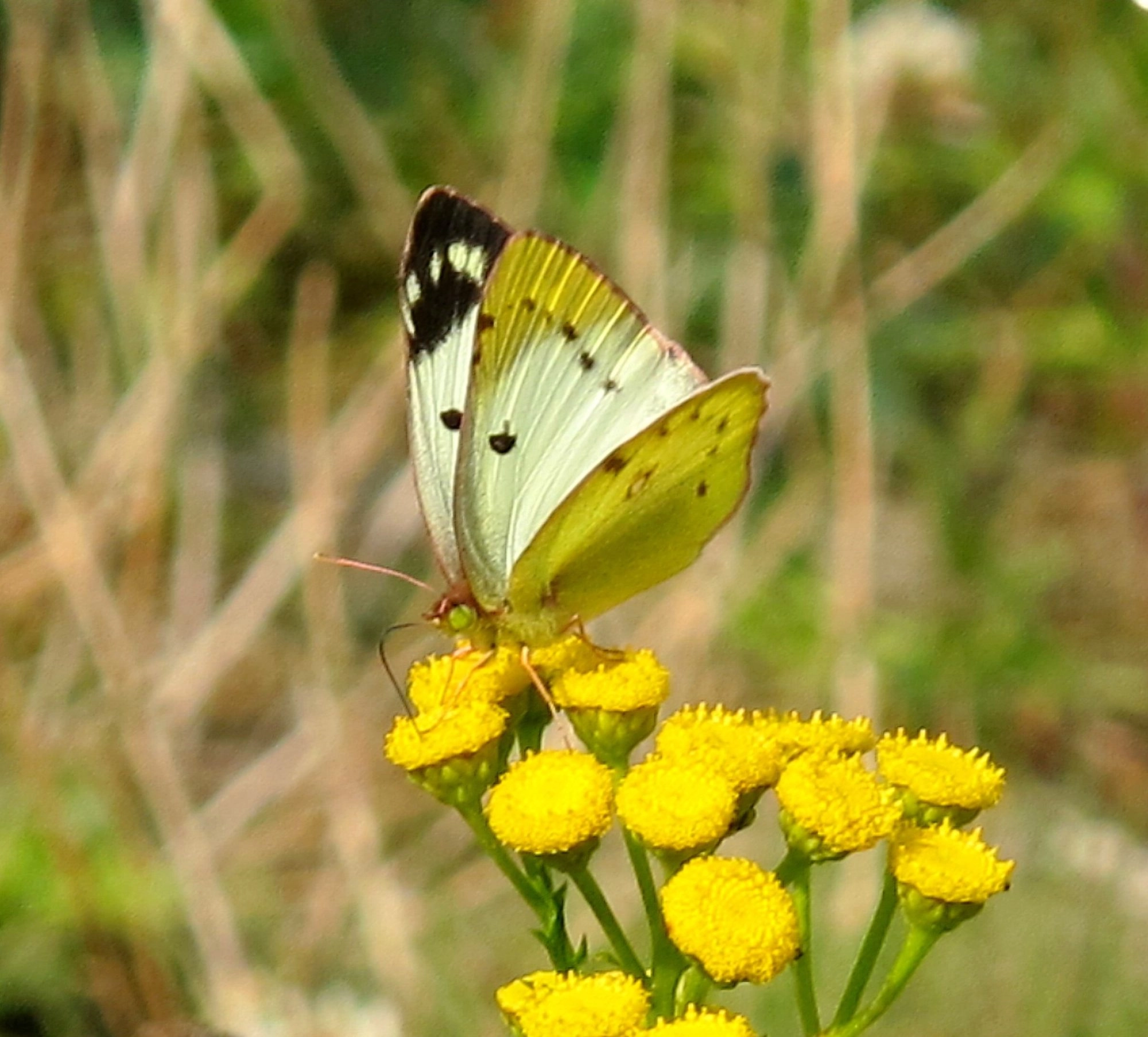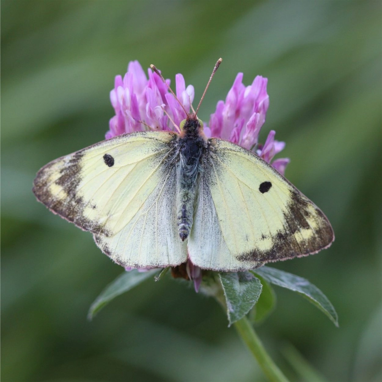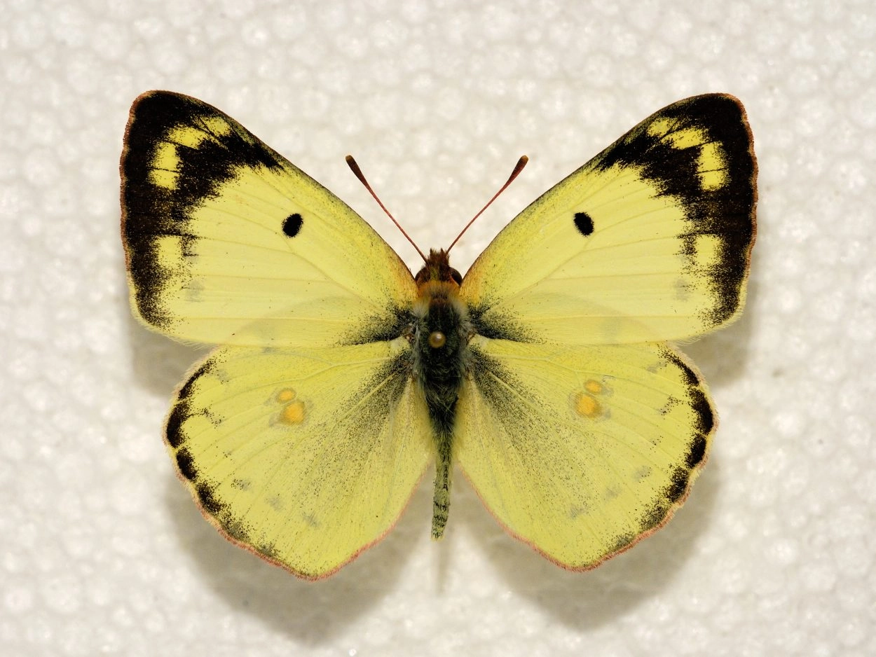 Oranje luzernevlinder (Colias croceus).N.B.: vergelijk behalve de uiterlijke kenmerken ook de tijd van het jaar waarin de rupsen voorkomen, het habitat en de waardplant(en).