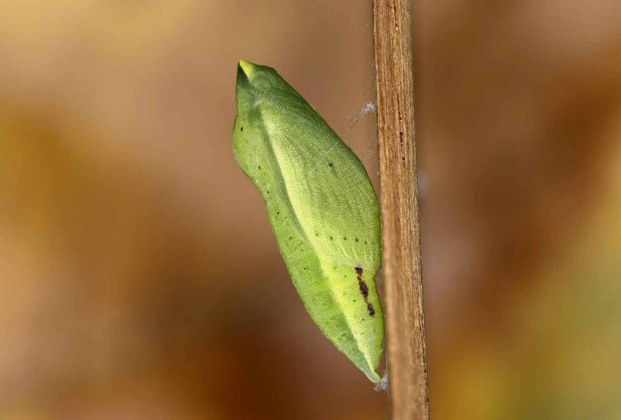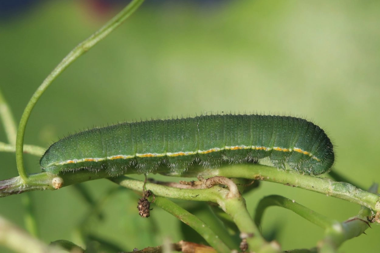 Tot 32 mm; lichaam groen, fijn zwart gespikkeld met een witte lengtestreep over de spiracula met daarin - aan weerszijden van ieder spiraculum - een rood of oranje veegje; kop groen.