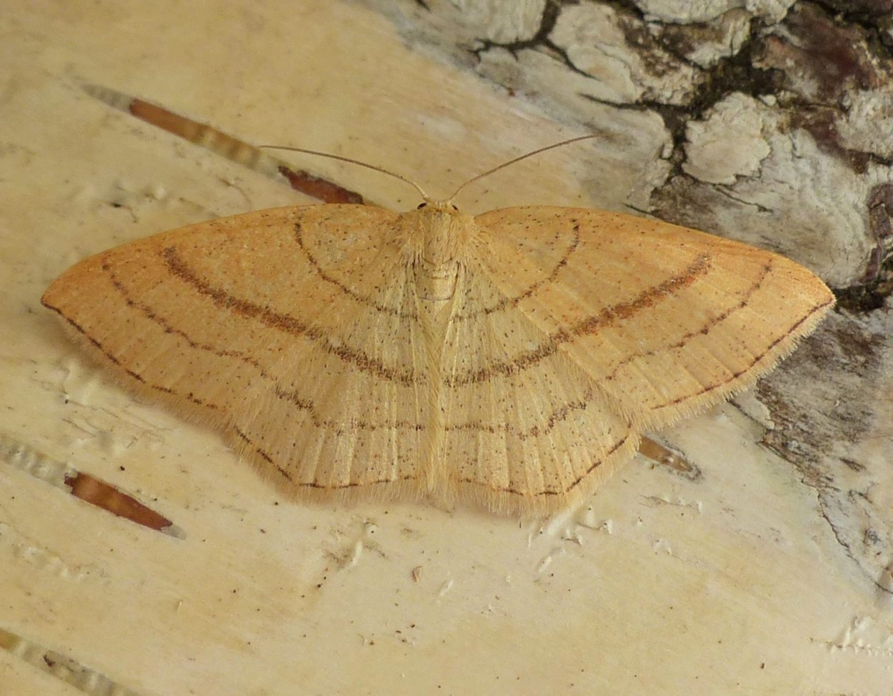 Voorvleugellengte: 14-16 mm. Vlinders van de eerste generatie zijn goed te herkennen aan het feit dat de tekening bestaat uit slechts drie grijze tot roodachtig grijze centrale dwarslijnen en een franjelijn, op de verder effen en nagenoeg onbespikkelde voor- en achtervleugel. De grondkleur varieert van bleek bruinachtig tot soms warm oranjeachtig geel. De binnenste- en de buitenste dwarslijn zijn nogal dun en soms slechts als een rij kleine puntjes zichtbaar. De middelste dwarslijn is juist dik en opvallend. Duidelijke oogjes ontbreken doorgaans; in plaats daarvan zijn vaak wel kleine witte vlekjes aanwezig. De vlinders van de tweede generatie zijn gewoonlijk iets kleiner en hebben een scherpere voorvleugelpunt. De vleugels zijn fijn maar duidelijk bespikkeld en bruiner van kleur of duidelijk rozeachtig bruin. De middelste dwarslijn is diffuser en minder uitgesproken dan die van voorjaars- vlinders. De tweede generatie heeft wel, met name op de achtervleugel, duidelijke donker omrande oogjes.