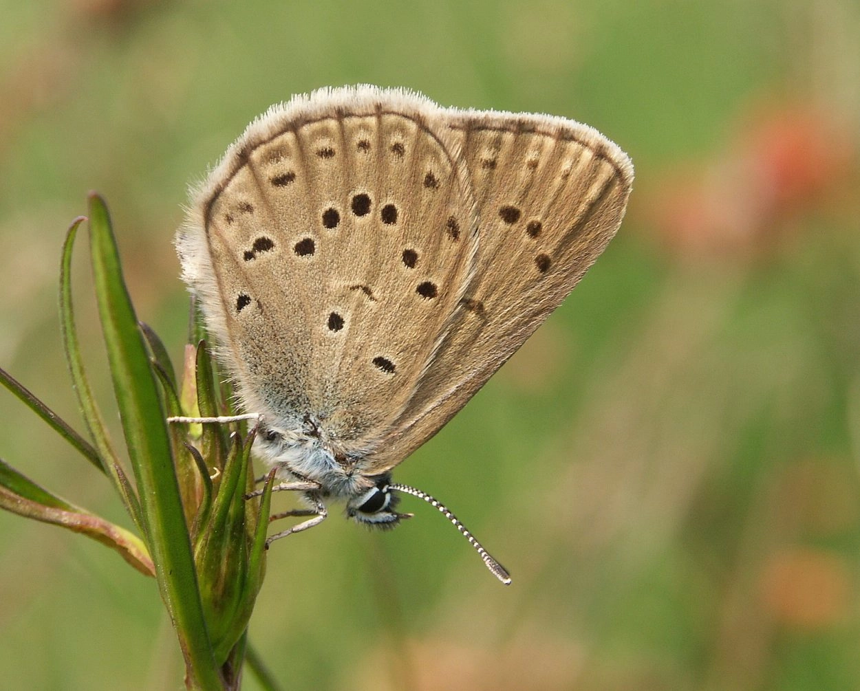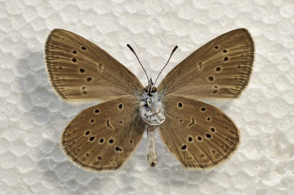 Voorvleugellengte: circa 17 mm. Bij het mannetje is de bovenkant van de vleugels blauw zonder vlekken. Het vrouwtje is grijsbruin met onduidelijke vlekken en soms een blauwe bestuiving. De onderkant van de vleugels is licht grijsachtig bruin met twee rijen witomrande zwarte vlekken.