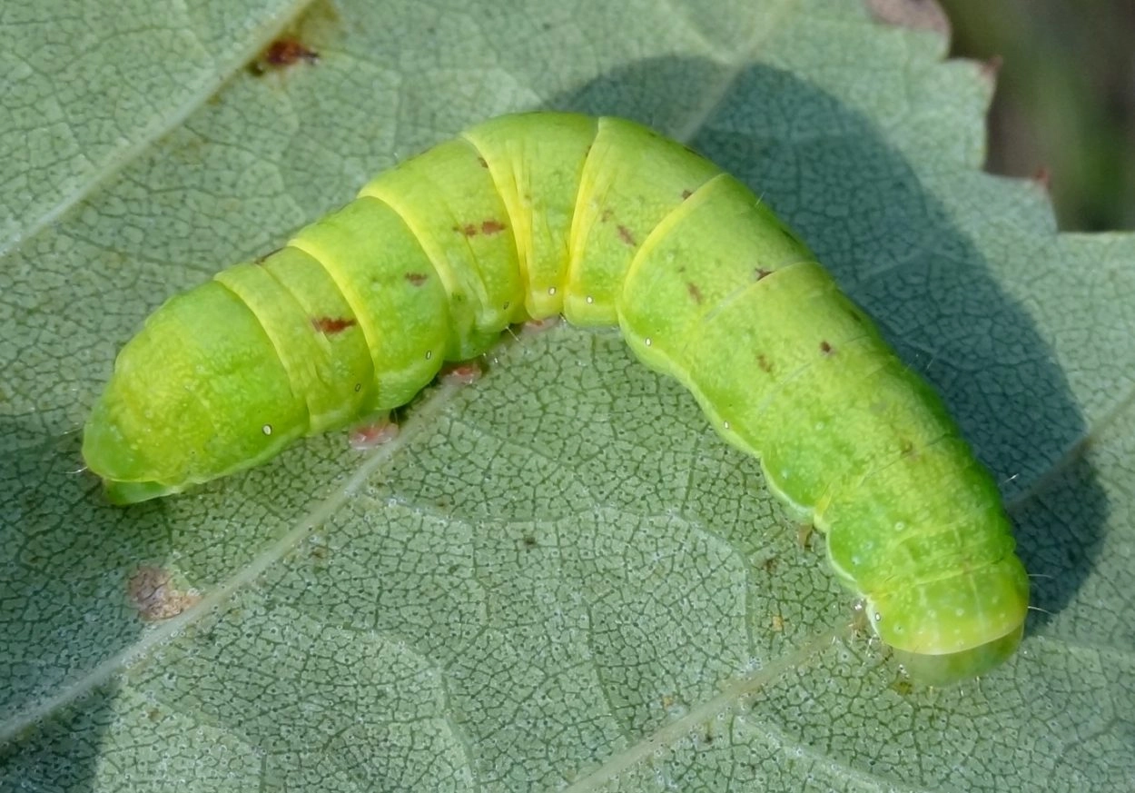 Tot 40 mm; lichaam varieert in kleur van groen tot roodachtig bruin met een groene zweem; over de rug drie rijen purperachtig bruine of zwartachtige lengtebalkjes; over de witte spiraculae een purperachtig bruine lengtestreep, waaronder een witachtige of lichtgroene lengteband van variabele breedte; kop groenachtig bruin.