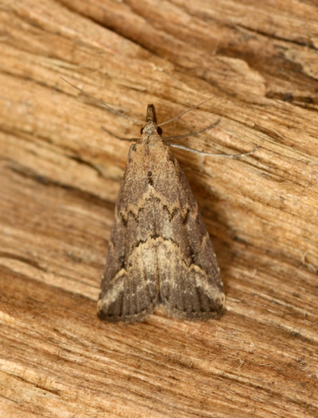 Voorvleugellengte: 9-11 mm. Deze snuituil kan vanwege de kleine afmetingen en de slanke bouw gemakkelijk worden aangezien voor een microvlinder, vooral wanneer de voorzijde van het lichaam in rust enigszins omhoog geheven is. De kleur van de smalle voorvleugel varieert van zandkleurig bruin tot grijsachtig bruin. De onduidelijke donkere middenvlek staat via een dikke donkere lijn in verbinding met de buitenste dwarslijn. In de vleugelpunt is vaak een lichte veeg zichtbaar. Al deze kenmerken kunnen vaag zijn; bij sommige vrijwel effen bruine exemplaren zijn alleen twee dwarslijnen zichtbaar. Evenals de andere snuituilen heeft deze soort een opvallende 'snuit', gevormd door de lange palpen.