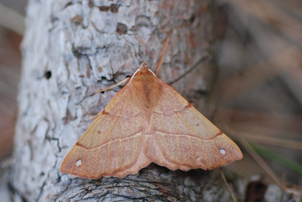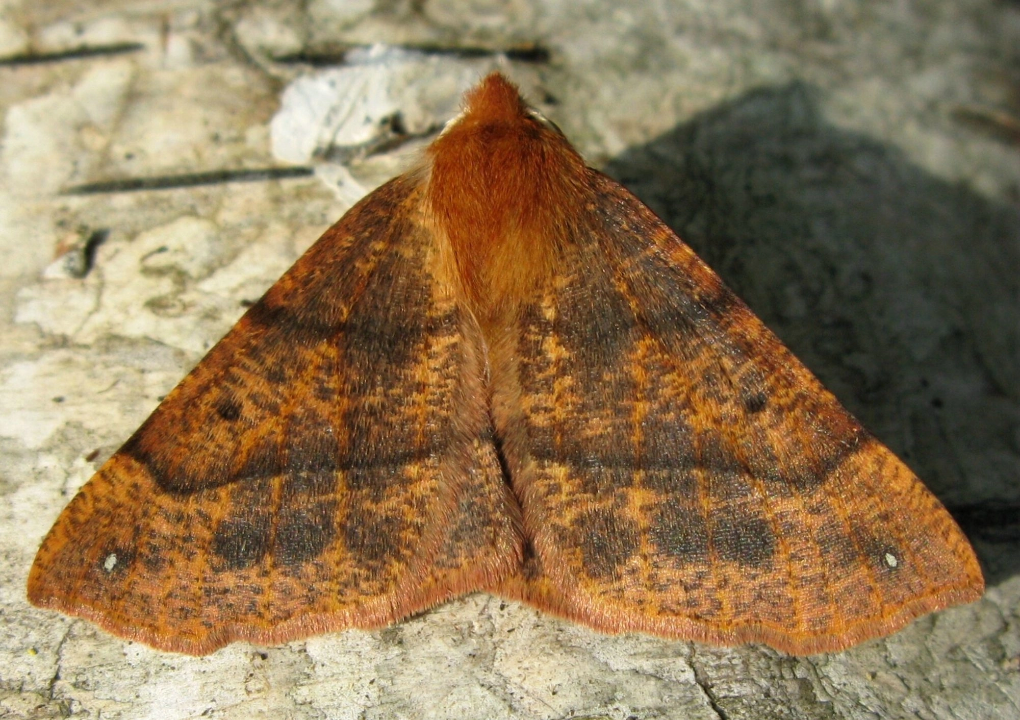 Voorvleugellengte: 19-23 mm. Een goed herkenbare soort die in rust de vleugels plat houdt. Het mannetje is overwegend oranje, soms meer reebruin of steenrood, het vrouwtje is meestal grijsbruin. Over de voorvleugel lopen meestal duidelijke centrale dwarslijnen; soms zijn ze vaag of onvolledig. Kenmerkend is de witachtige stip vlak bij de vleugelpunt. Zowel het mannetje als het vrouwtje heeft een klein naar buiten wijkend puntje aan de voorvleugelpunt. Het mannetje heeft brede geveerde antennen. Het vrouwtje heeft ongeveerde antennen, een iets smallere voor- en achtervleugel en de dwarslijnen zijn over het algemeen duidelijker afgetekend.