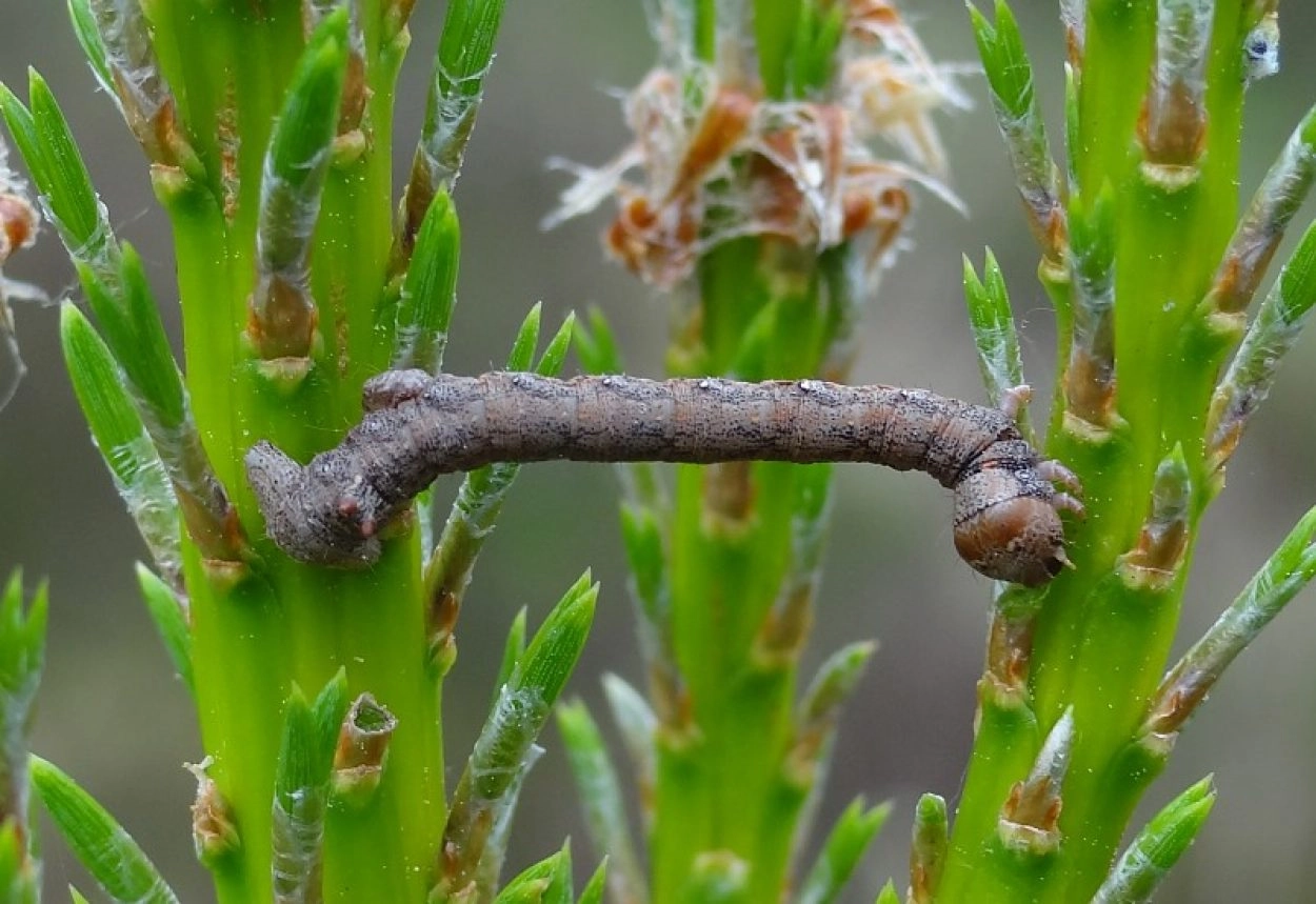 Tot 50 mm; lichaam grijs, soms met een purperen zweem, over rug en flanken een rij okerkleurige of gele vlekken; segment twaalf met een paar kegelvormige wratten op de rugzijde; kop roodachtig bruin met lichtere tekening.