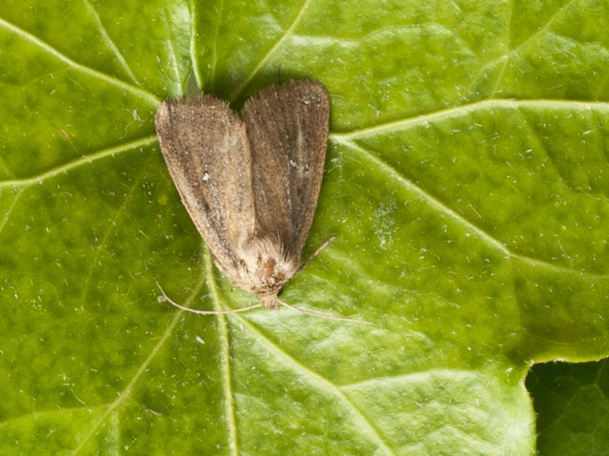 Voorvleugellengte: 11-16 mm. De vrij brede voorvleugel heeft een stompe vleugelpunt en een effen, vaak roodachtig getinte licht- of donkerbruine, soms zwartachtige grondkleur. Hierop bevindt zich een fijne grijsachtige bestuiving die als smalle veeg in het wortelveld begint en zich naar het midden van de vleugel breed wigvormig uitbreidt. In het zoomveld is soms een lichte adering aanwezig. Kenmerkend is de doorgaans krijtwitte donkergerande niervlek die bestaat uit twee afzonderlijke vlekjes; in sommige gevallen zijn deze vlekjes donker gekleurd of bestaat de niervlek uit een enkele smalle donkere vlek. Heel soms is aansluitend aan de witte niervlek een gedeeltelijke witte ader zichtbaar, waardoor een witte L op de vleugel aanwezig lijkt te zijn.