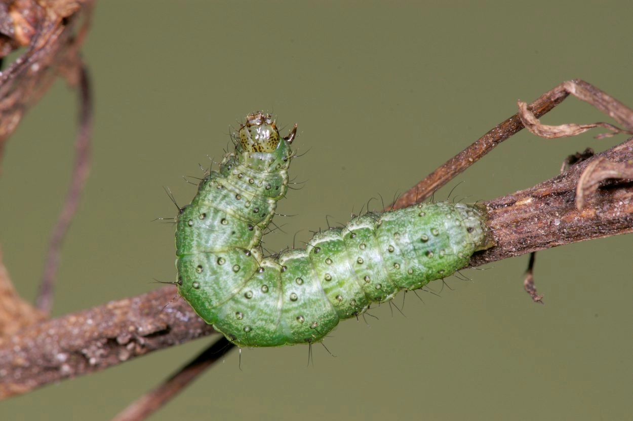 Jonge rupsen van de getekende gamma-uil lijken op rupsen van de gamma-uil (Autographa gamma).