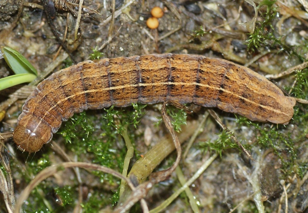 Tot 40 mm; lichaam okerachtig bruin; sommige vormen zijn vrijwel ongetekend, terwijl andere een bleke middenstreep met aan weerszijden zwarte vlekken op de rug hebben, met op de flanken een brede, donkerbruine lengteband; kop geelachtig bruin. De jonge rupsen zijn groen.