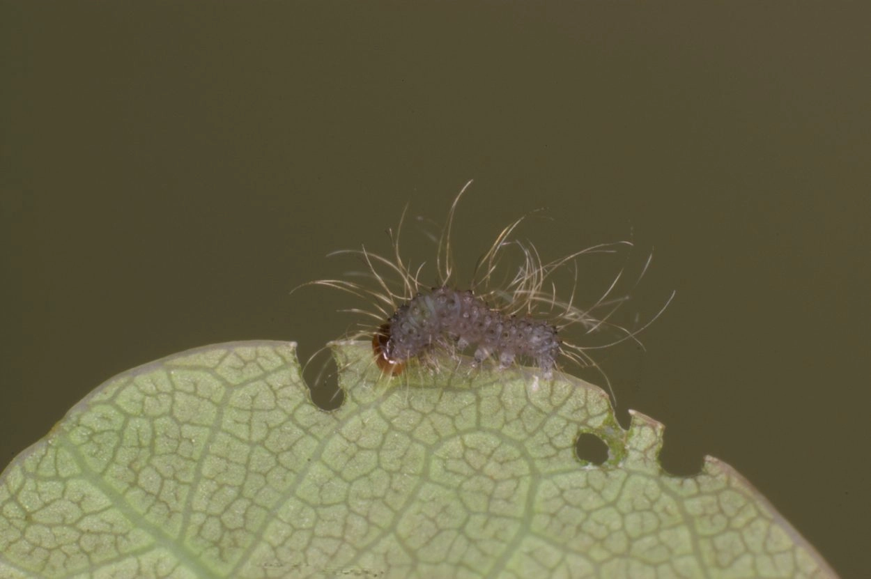 Tot 40 mm; kop en lichaam overdekt met fijne, rooodachtig bruine haartjes; lichaam zacht, bruin of grijs, naar de rug toe donkerder; over de rug een rij vierkante, zwarte vlekken; nekschild op segment één zwart; kop glimmend zwart.